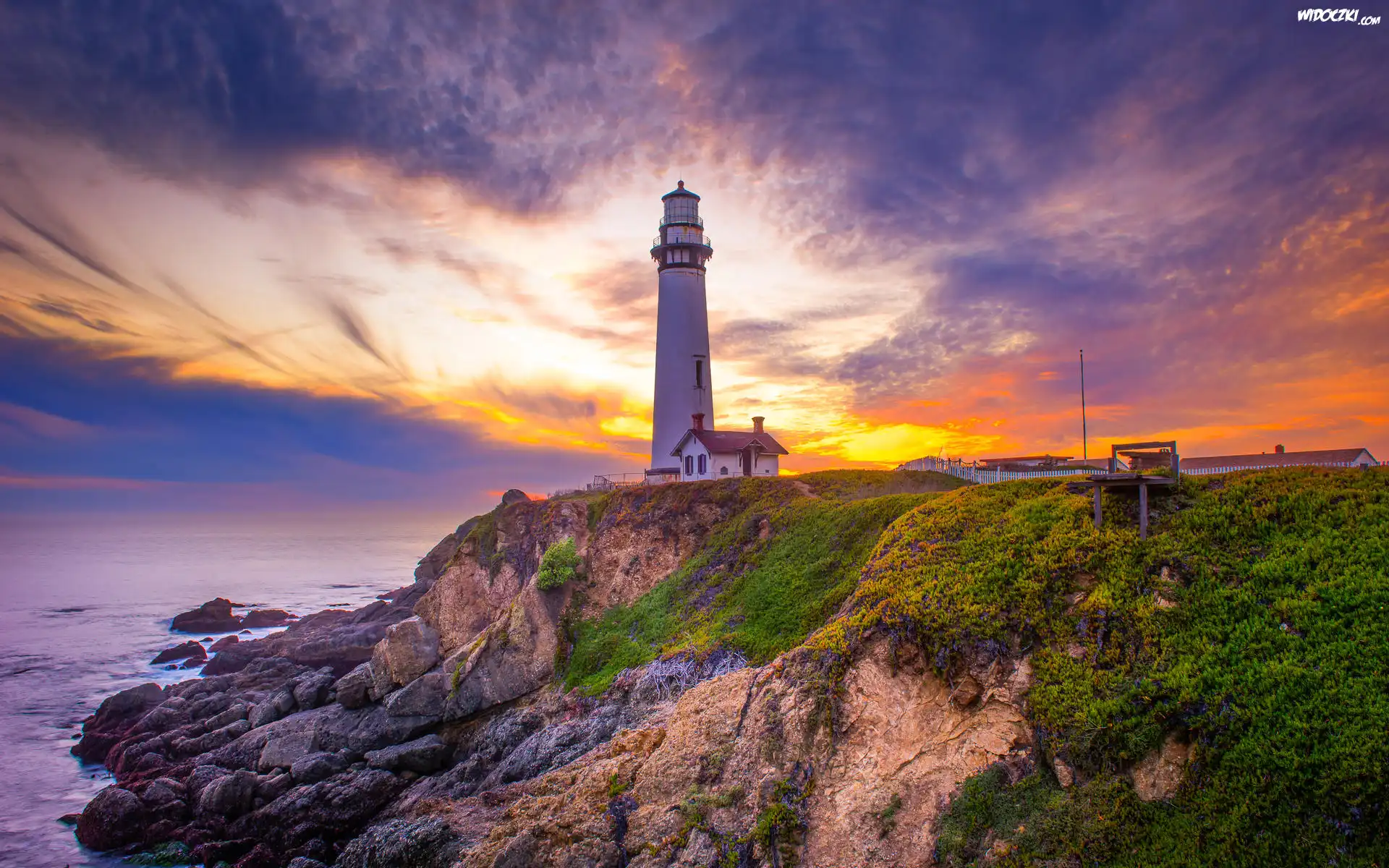Wybrzeże, Morze, Skały, Latarnia morska, Pigeon Point, Kamienie, Chmury, Zachód słońca, Santa Cruz, Kalifornia, Stany Zjednoczone |