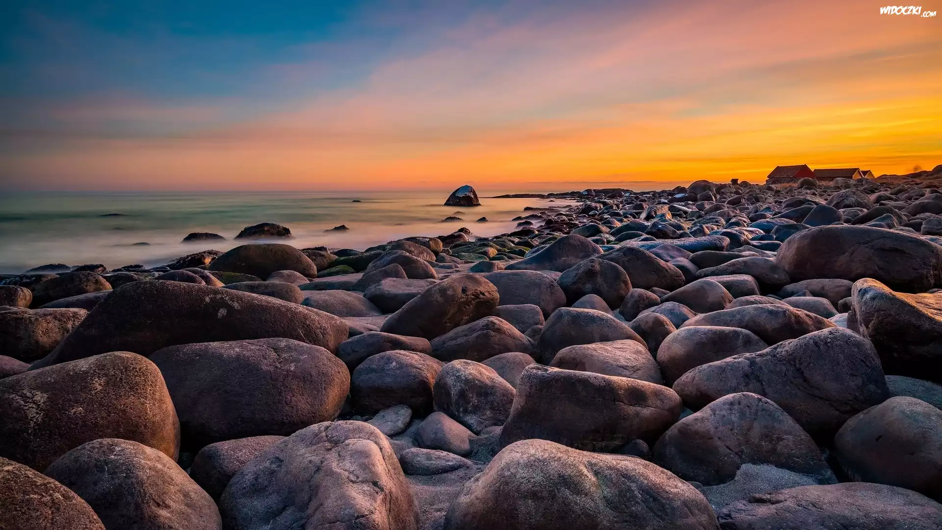 Zdjęcia, Wybrzeże, Morze, Kamienie, Domy, Zachód słońca