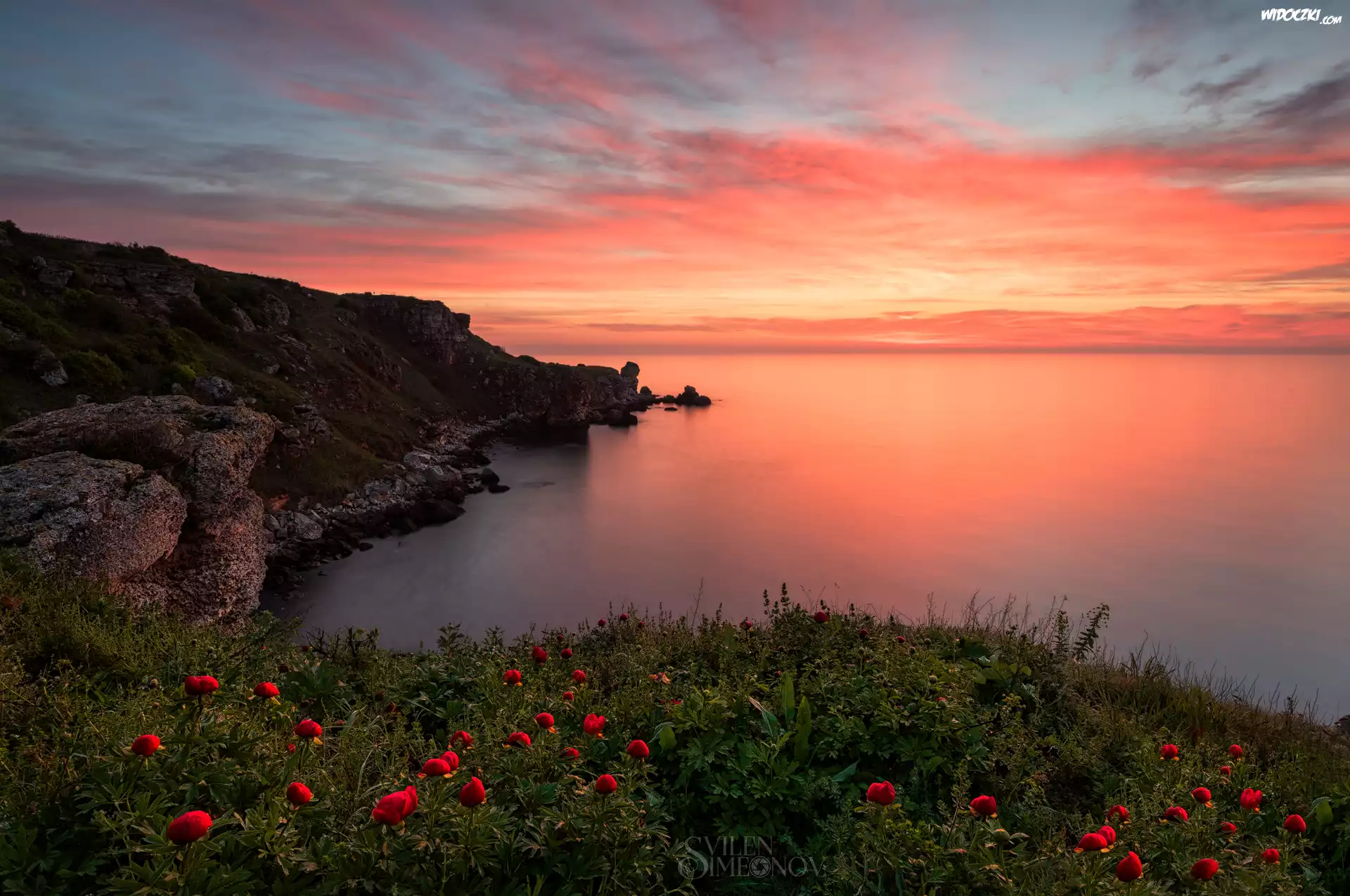 Zdjęcia, Wybrzeże, Kwiaty, Zachód słońca