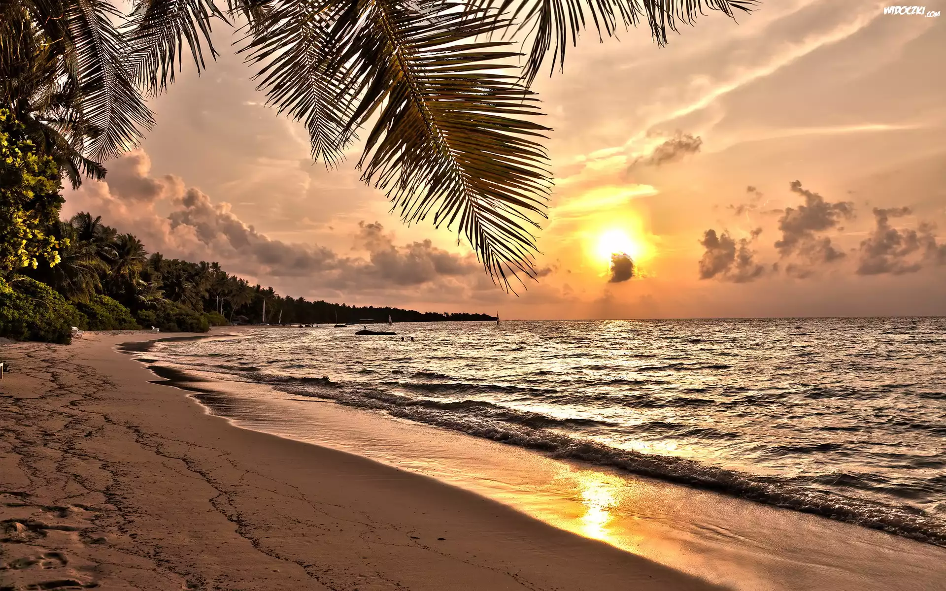 Zdjęcia, Wybrzeże, Plaża, Palmy, Żaglówki, Zachód, Słońca
