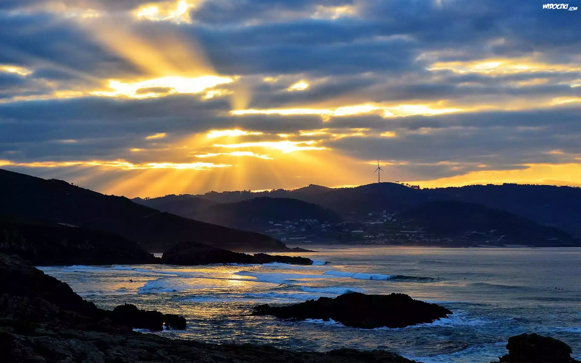 Niebo, Chmury, Słońce, Blask Plaża, Kreta, Grecja Góra, Niebo Góry, Budowle, Skały Grecja, Santorini, Woda, Łódź Wybrzeże, Wzgórza Latarnia, Morska, Wybrzeże, Skały, Jacht Francja, Mimizan Kanał, Most, Kontenerowiec, Statki Morze, Brzeg, Skały, Jaskinie Las, Drzewa, Wrzosy Wodospad Skały Droga, Skały Morze, Skały, Windsurfing