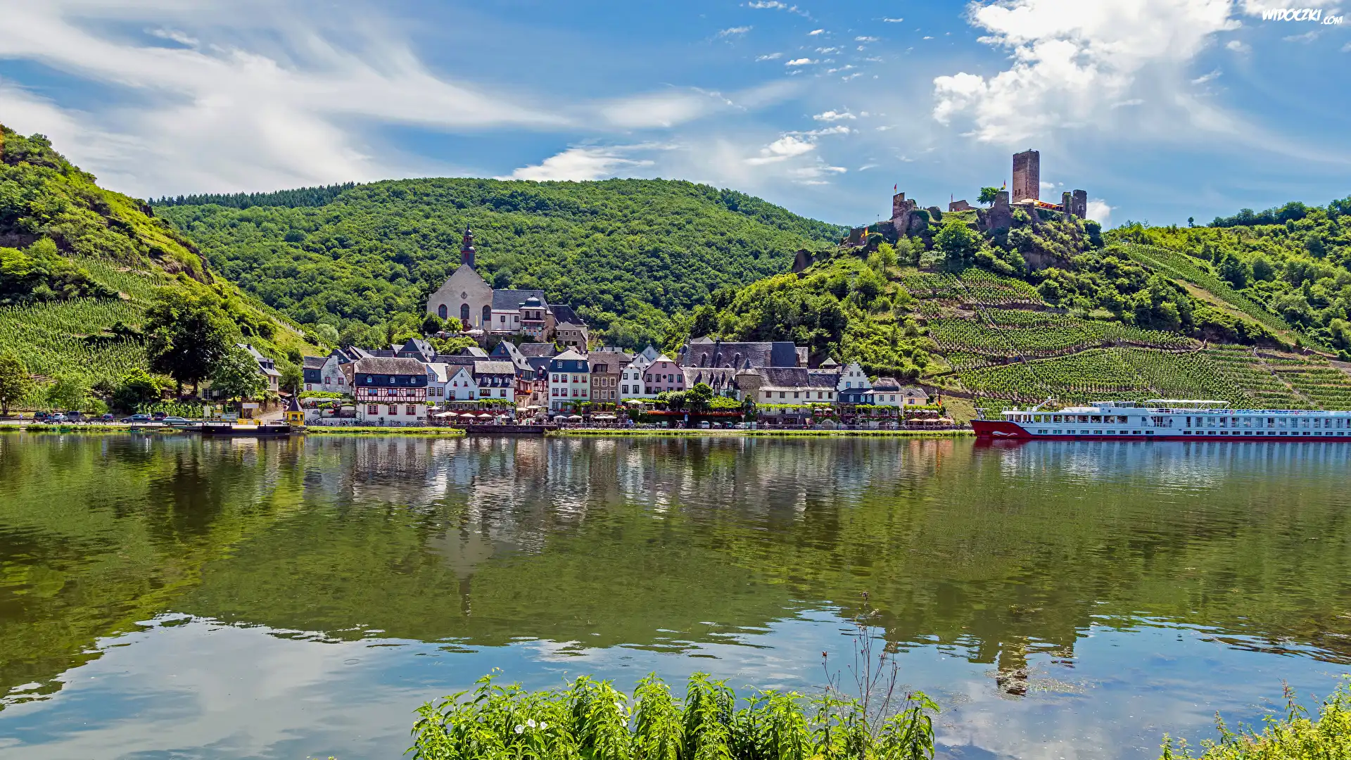 Zdjęcia, Domy, Miasteczko, Rzeka, Wzgórza, Las, Drzewa, Ruiny, Statek wycieczkowy