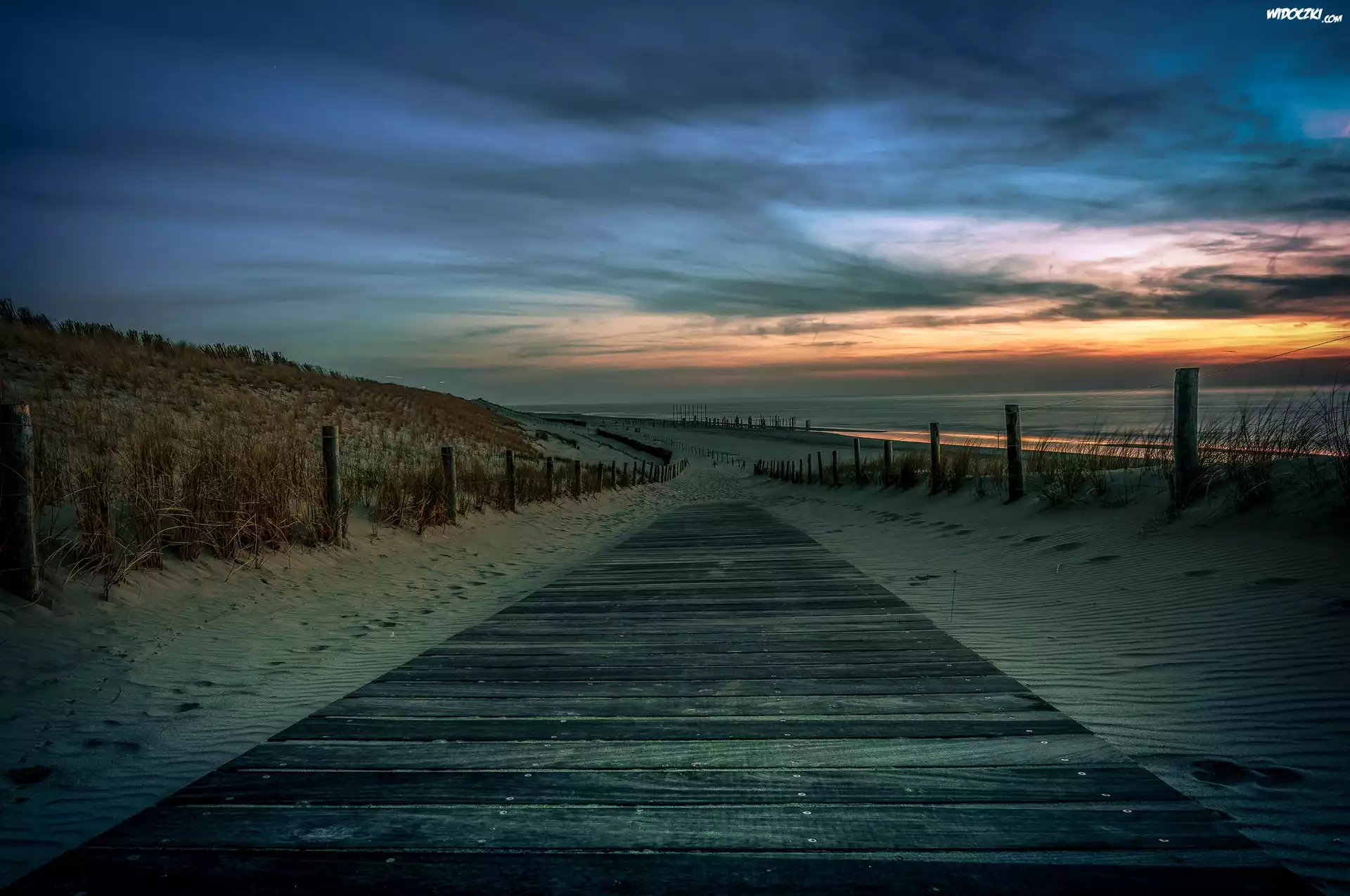 Holandia, Wybrzeże, Morze Północne, Zachód Słońca, Plaża, Kładka, Piasek, Wydmy