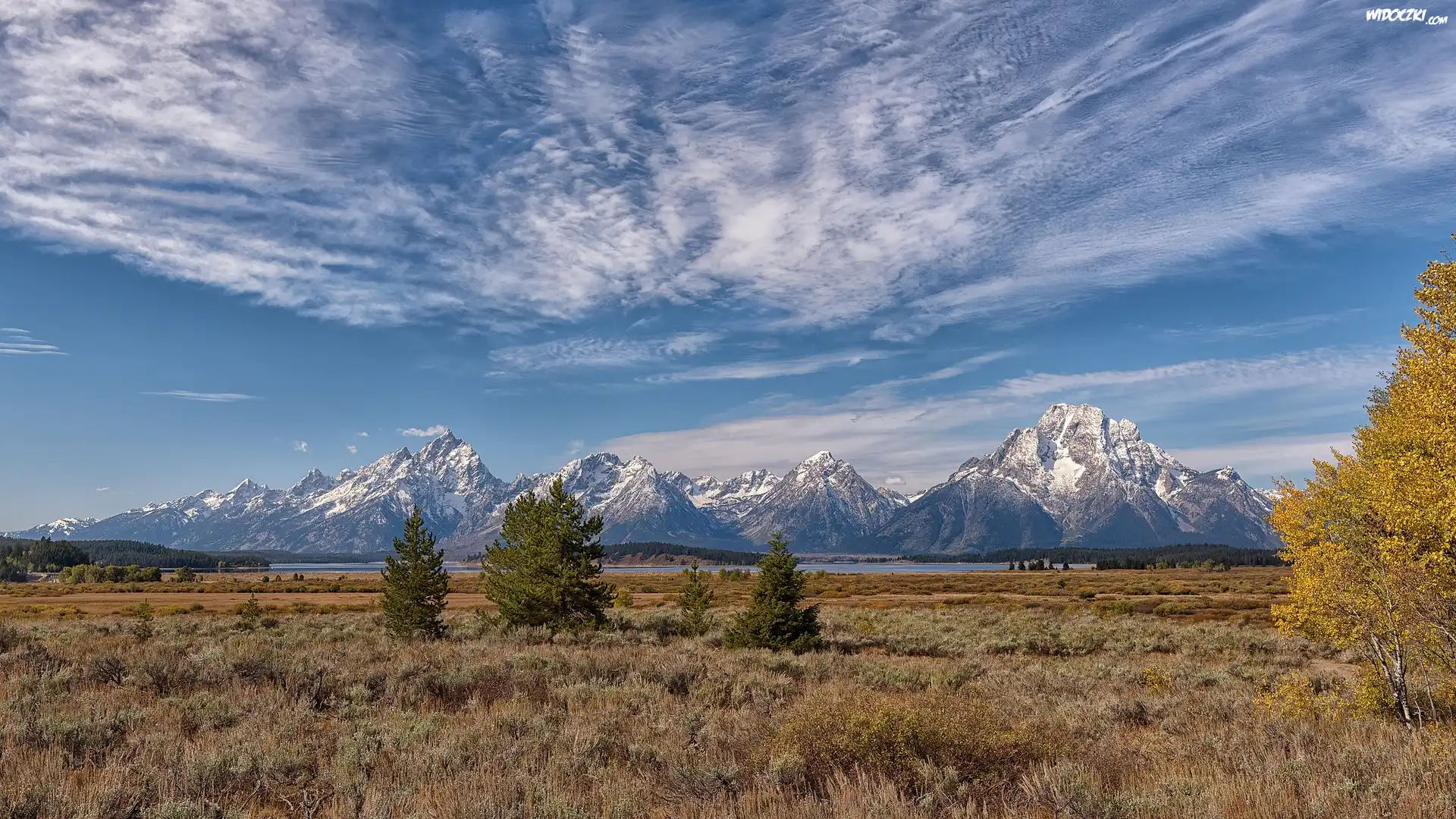 Zdjęcia, Park Narodowy Grand Teton, Góry, Teton Range, Drzewa, Stan Wyoming, Stany Zjednoczone