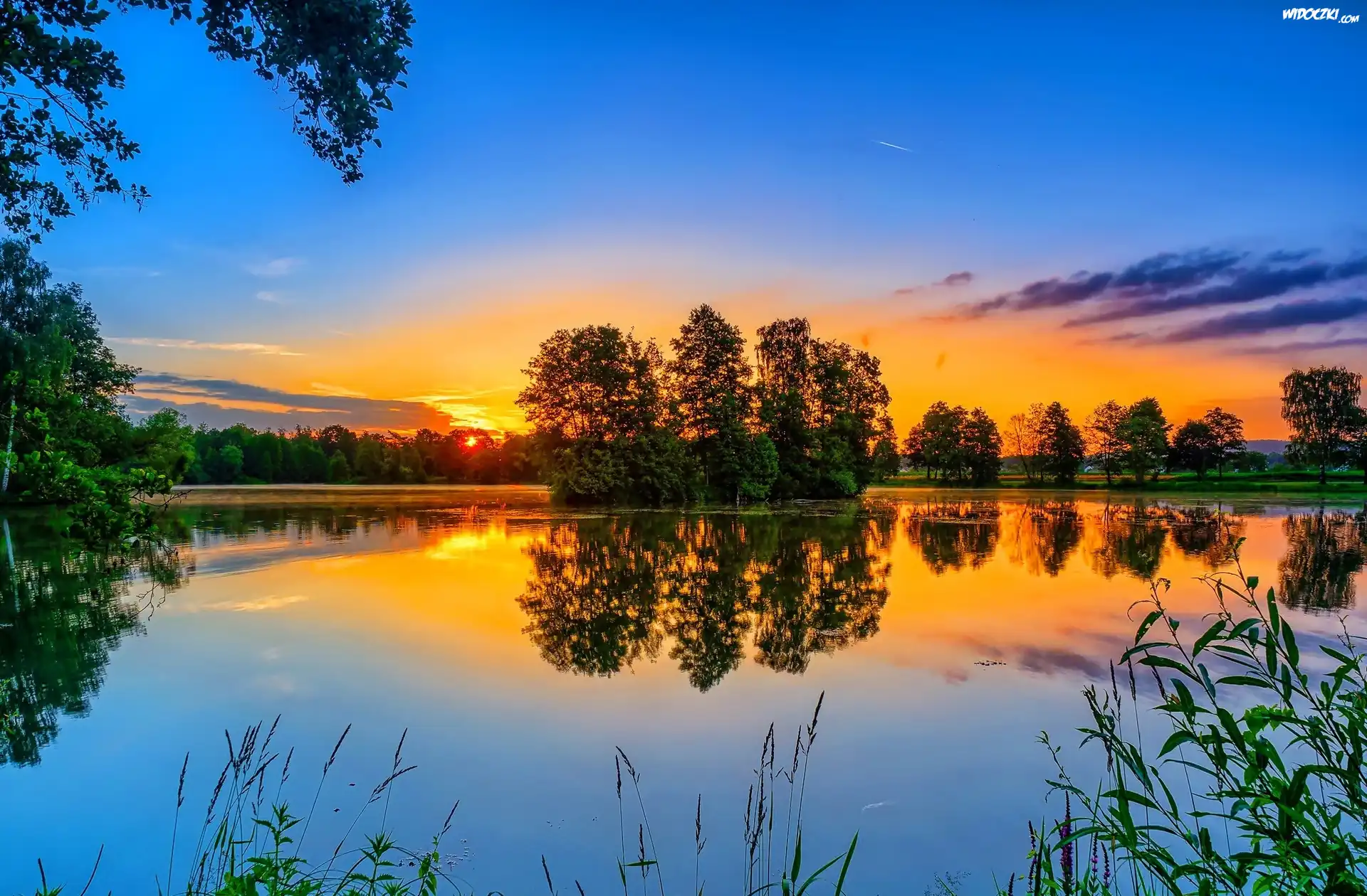 Zdjęcia, Jezioro, Wysepka, Drzewa, Las, Trawa, Zachód, Słońca
