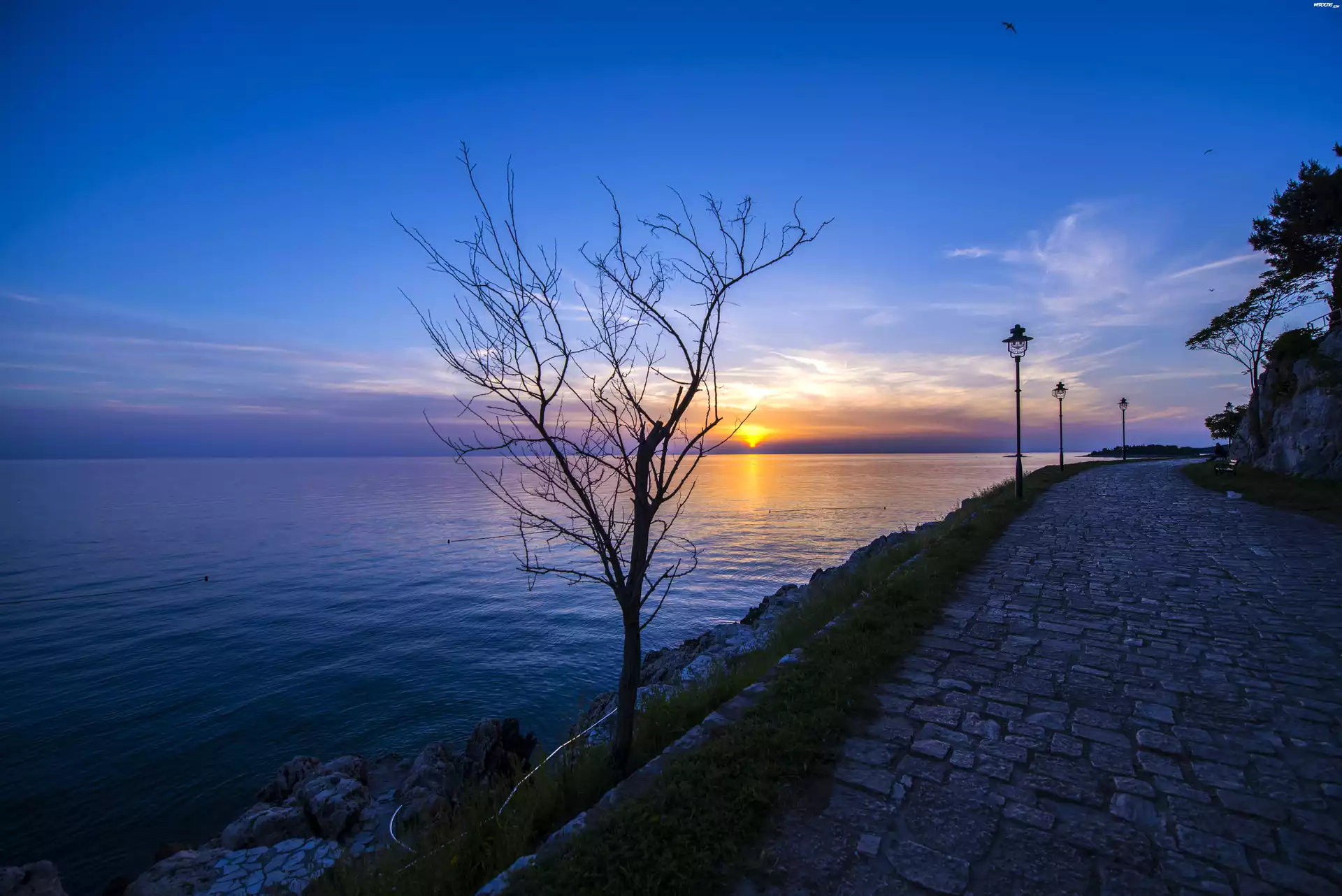 Zdjęcia, Jezioro, Wysepka, Aleja, Drzewa, Ławki, Latarnie, Zachód, Słońca