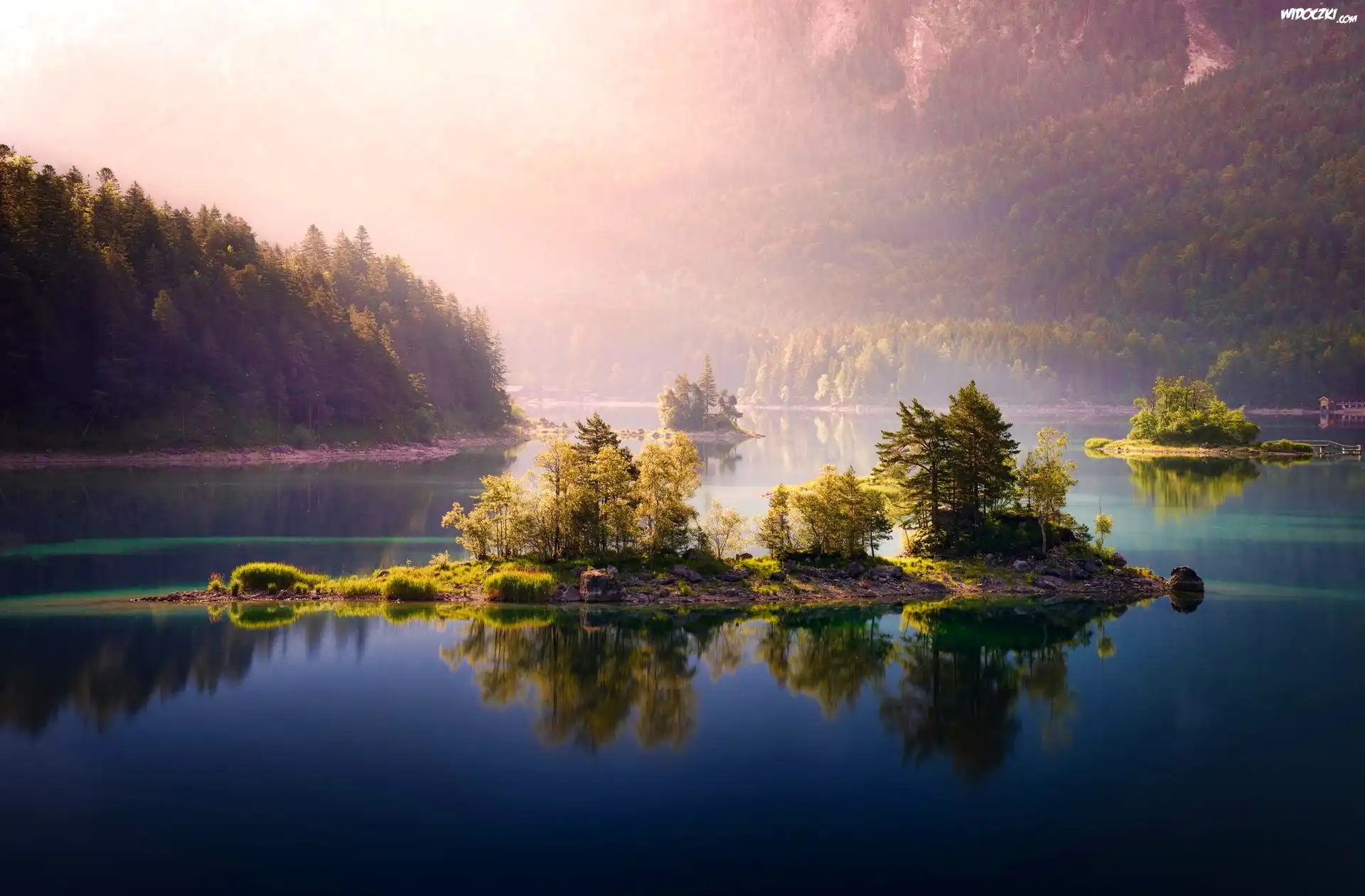 Jezioro, Wysepki, Lasy, Wschód Słońca, Mgła, Poranek