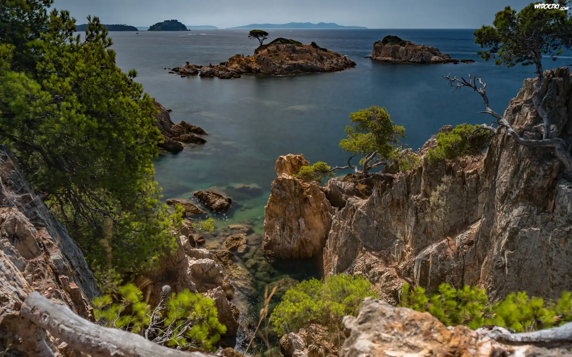 Zdjęcia, Morze, Skały, Drzewa, Wysepki