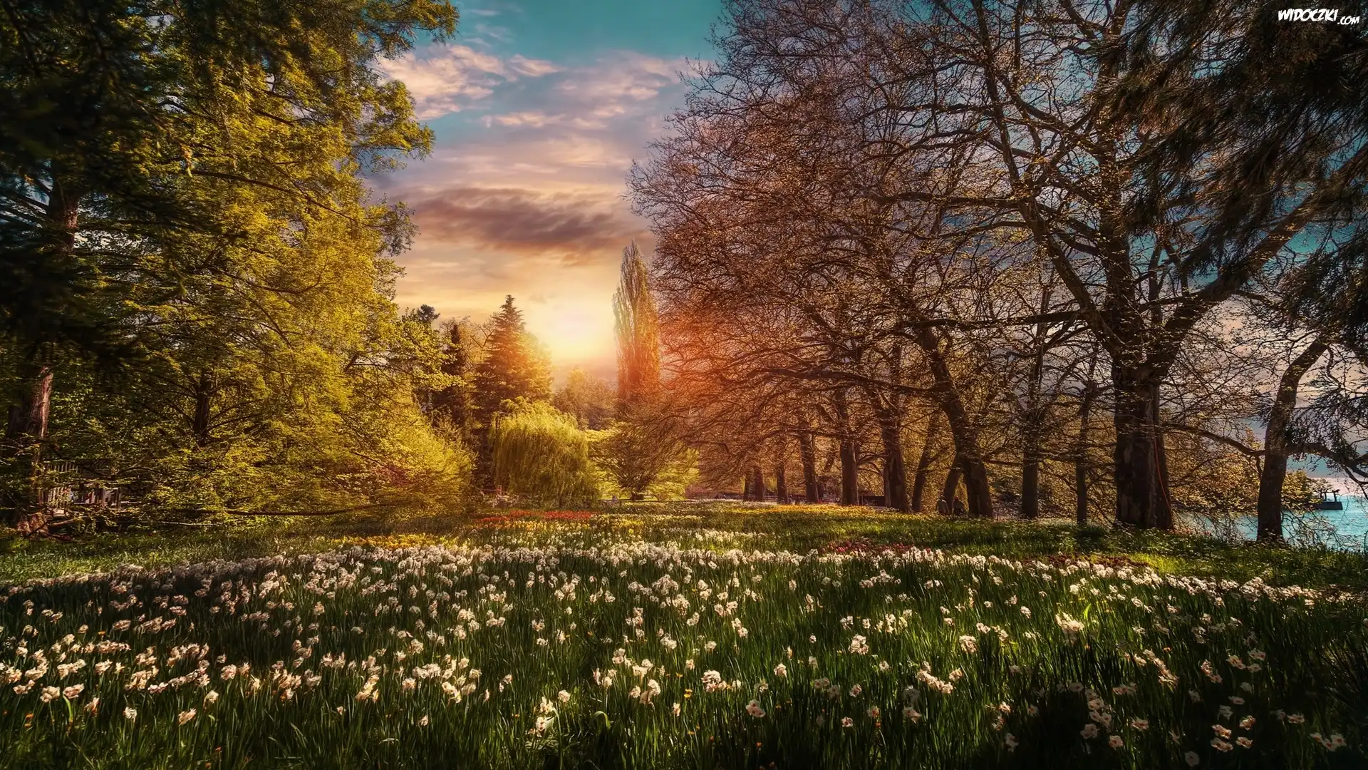 Zdjęcia, Park, Ogród, Wyspa Mainau, Badenia-Wirtembergia, Niemcy, Kwiaty, Drzewa, Wschód słońca