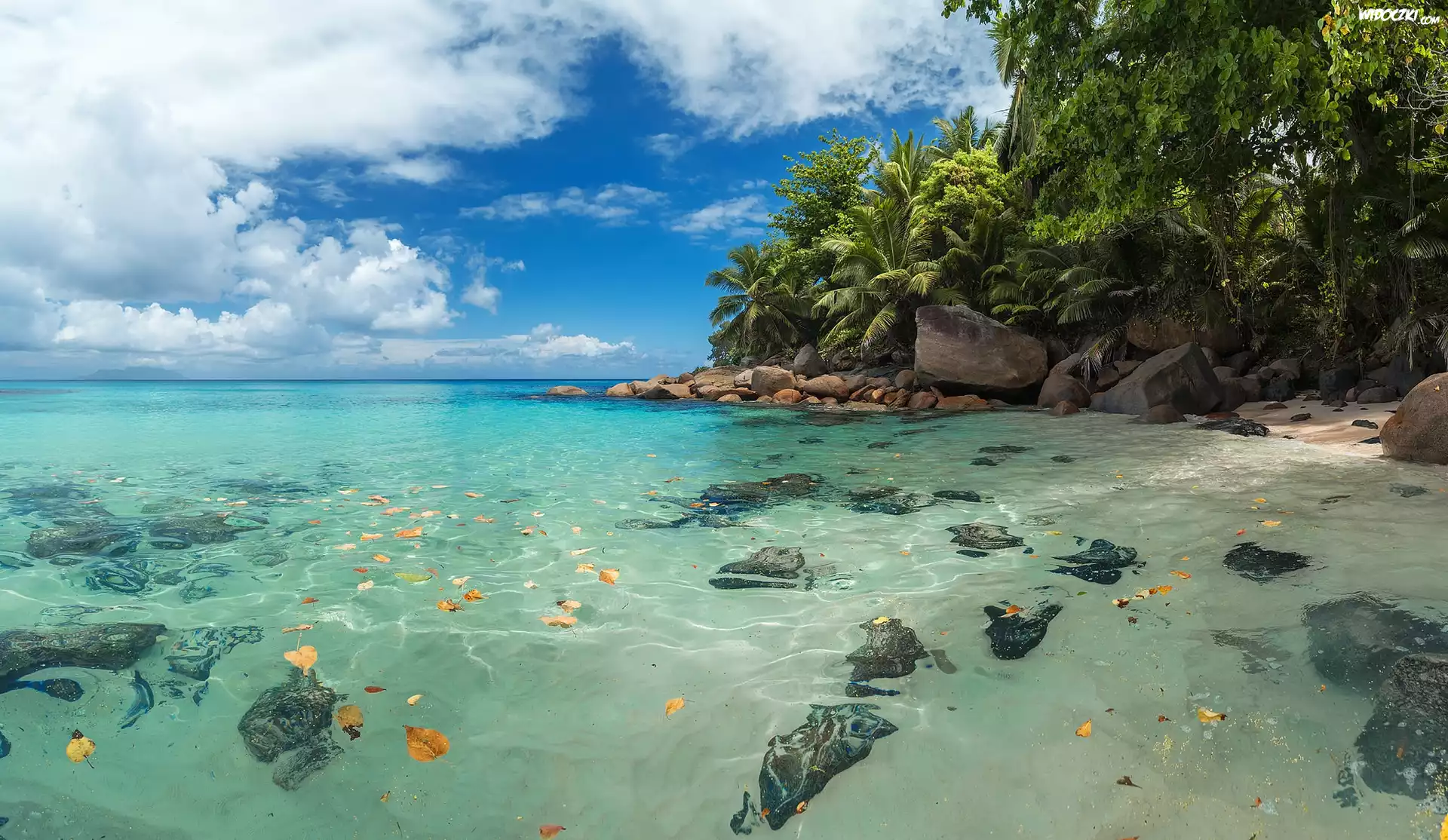 Seszele, Wyspa Mahe, Morze, Głazy, Palmy, Roślinność, Chmury