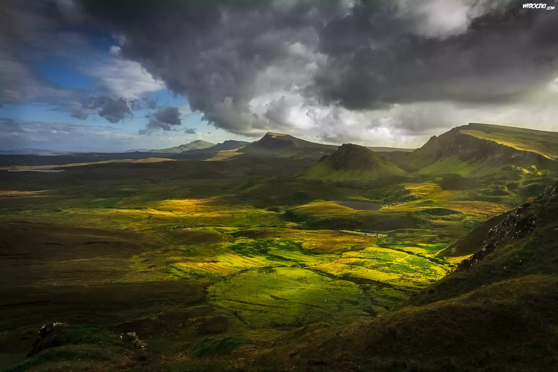 Zdjęcia, Szkocja, Wyspa Skye, Półwysep Trotternish, Wzgórza, Ciemne, Chmury
