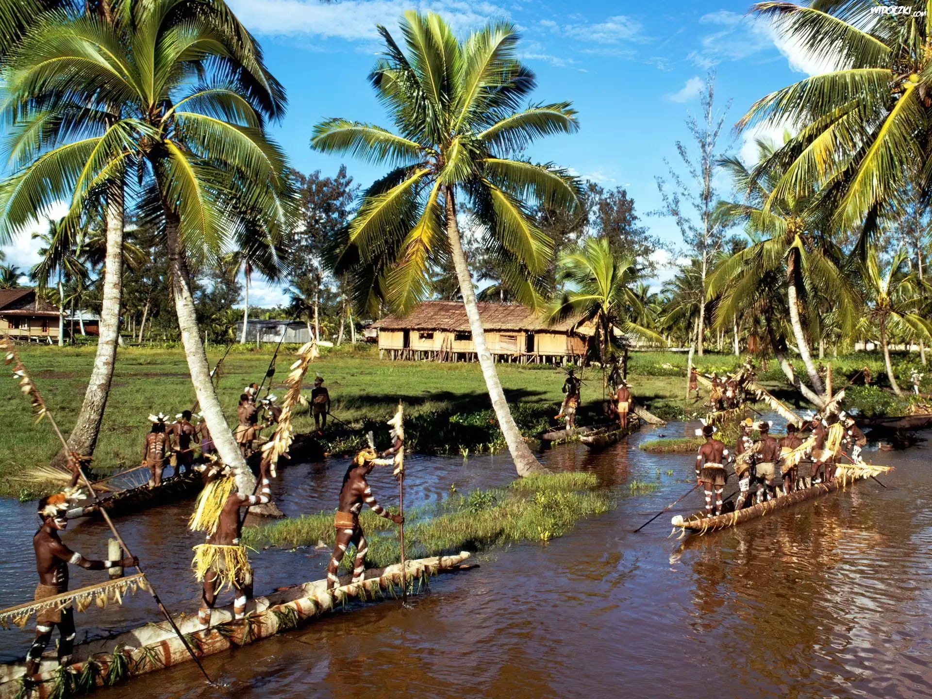 Wyspa, Indonezja, Rzeka, Czółna, Palmy
