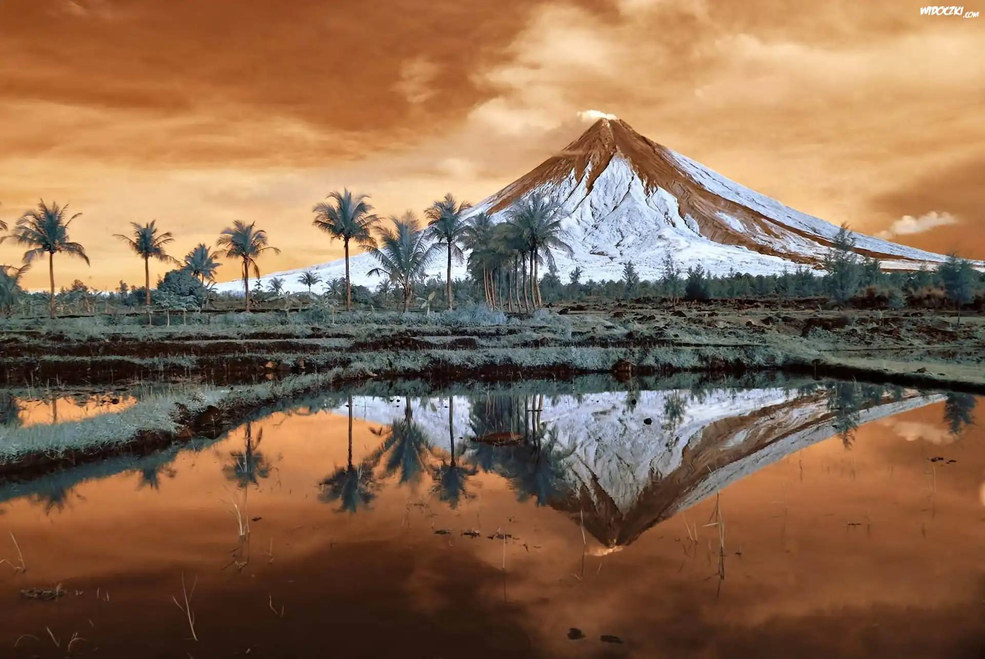 Zdjęcia, Filipiny, Wyspa, Wulkan, Mayon, Drzewa, Morze, Odbicie