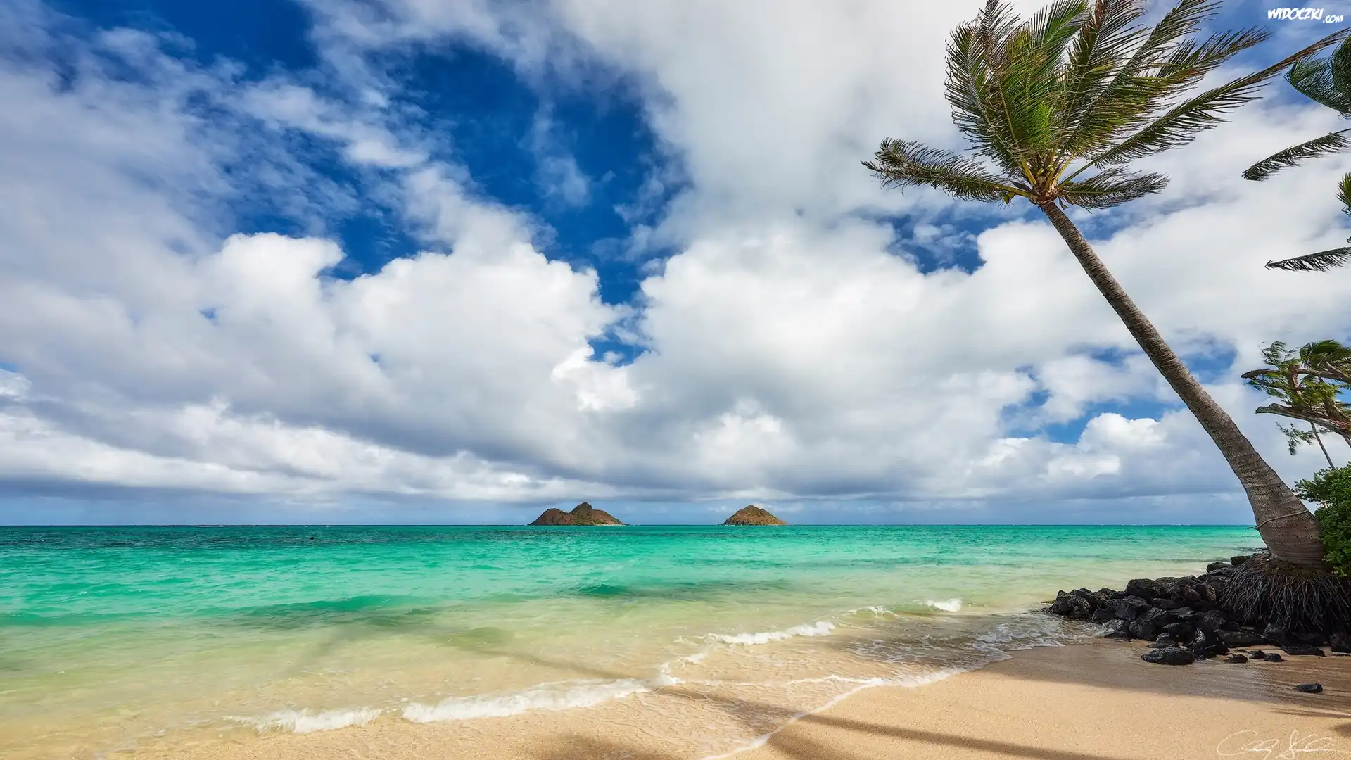 Zdjęcia, Hawaje, Wyspa Maui, Plaża, Morze, Palmy, Chmury