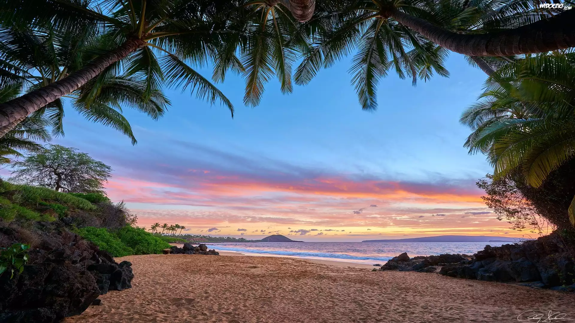 Zdjęcia, Hawaje, Wyspa Maui, Morze, Roślinność, Palmy, Plaża