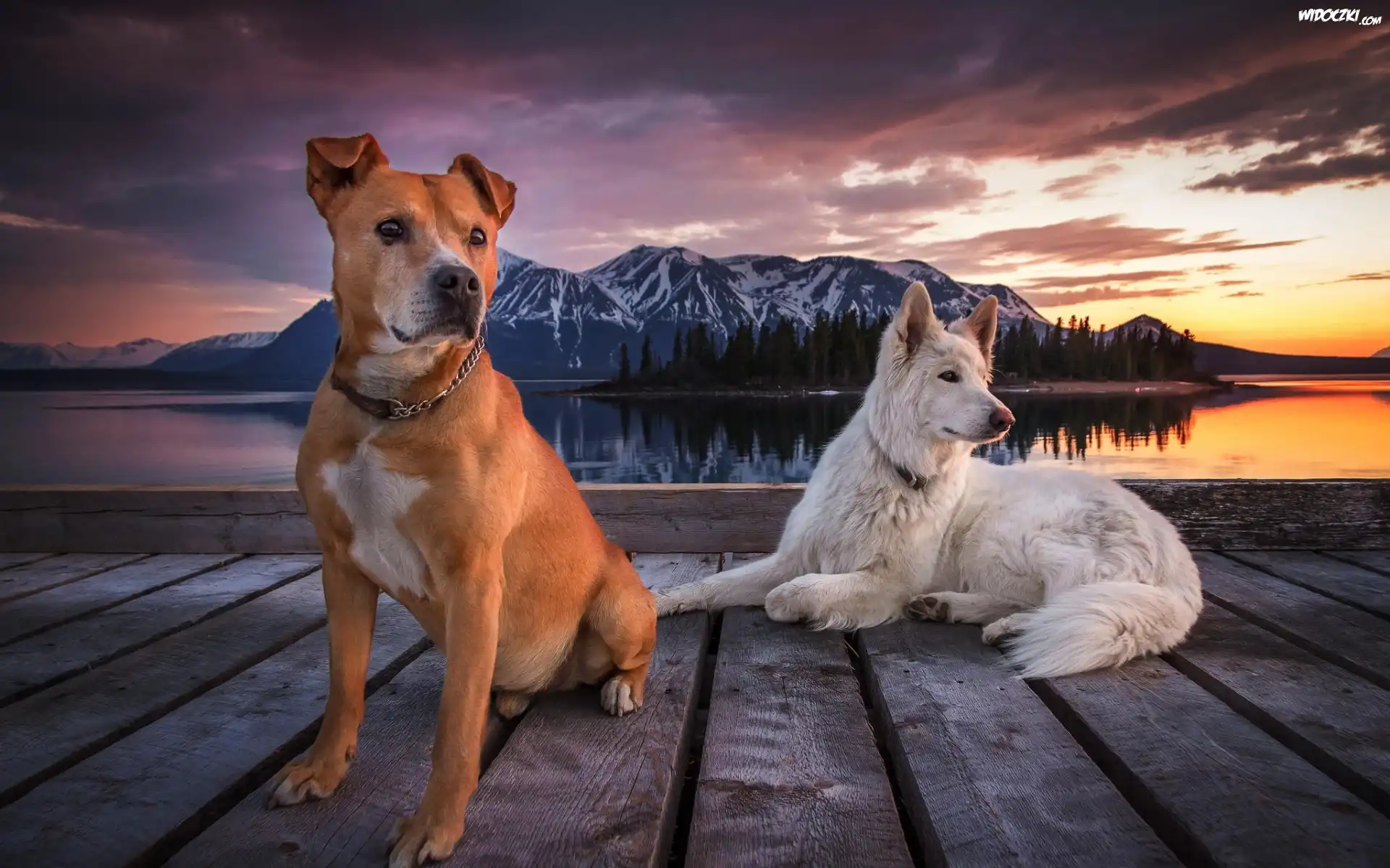 Zdjęcia, Jezioro, Wyspa, Góry, Pomost, Psy, Zachód, Słońca