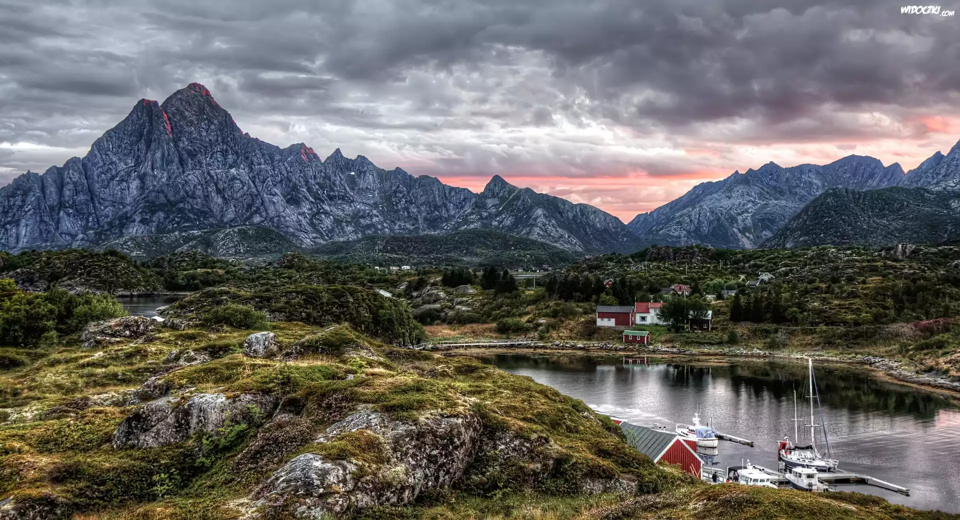 Zdjęcia, Norwegia, Lofoty, Wyspa Austvagoy, Miejscowość Kabelvag, Góry, Domy, Zatoka, Motorówki, Żaglówka