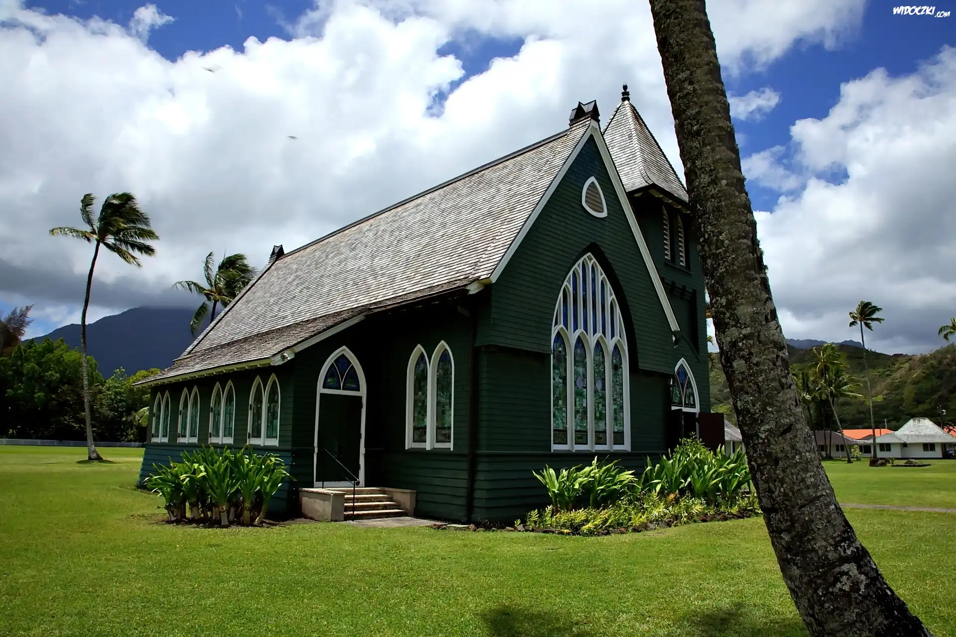 Zdjęcia, Wyspa, Kauai, Kościółek, Palmy, Obłoki
