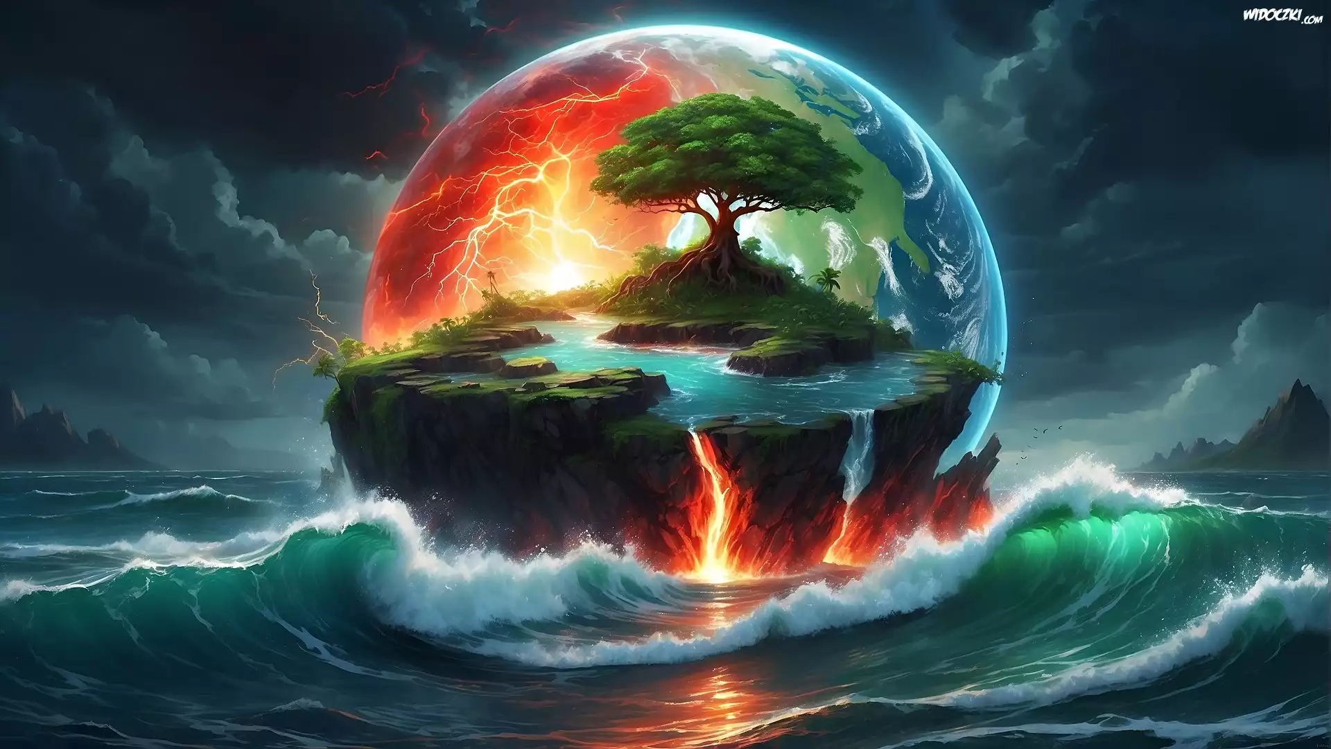 Fantasy, Morze, Planeta, Wyspa, Drzewo, Ogień, Pioruny