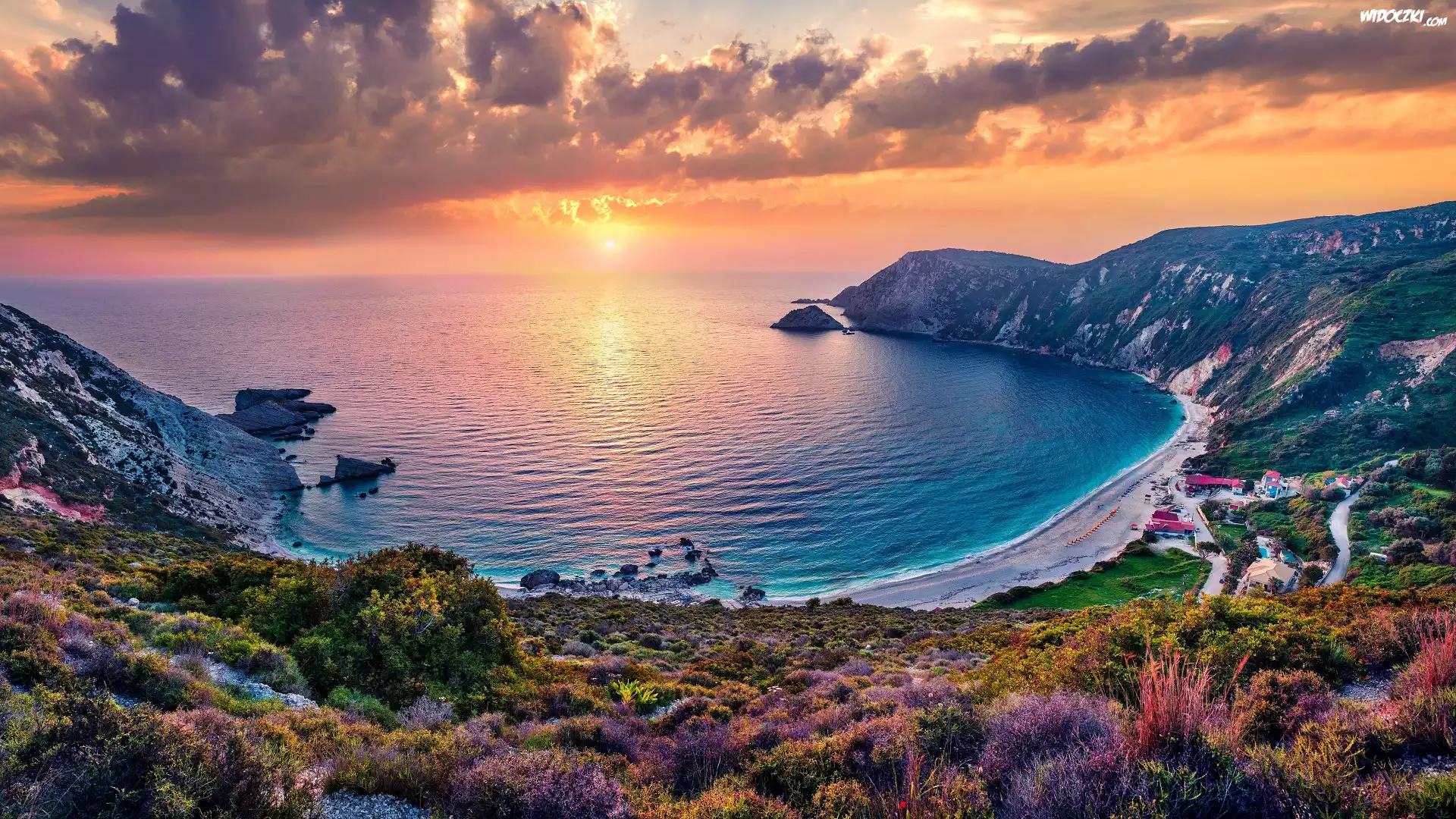 Zdjęcia, Morze, Zatoka, Plaża, Góry, Zachód słońca, Chmury, Petani Beach, Wyspa Kefalonia, Grecja