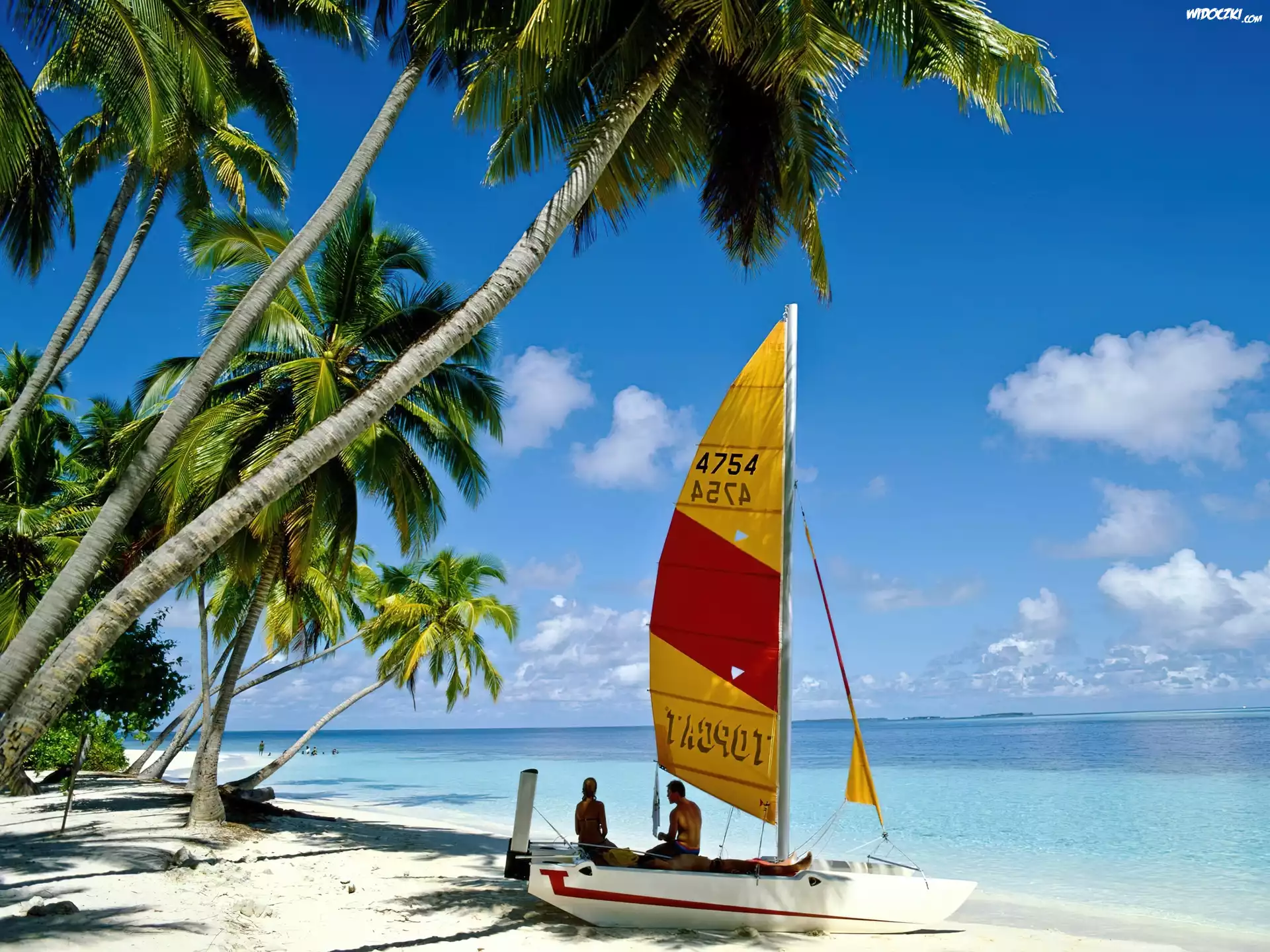 Zdjęcia, Wyspa, Palmy, Plaża, Żaglówka