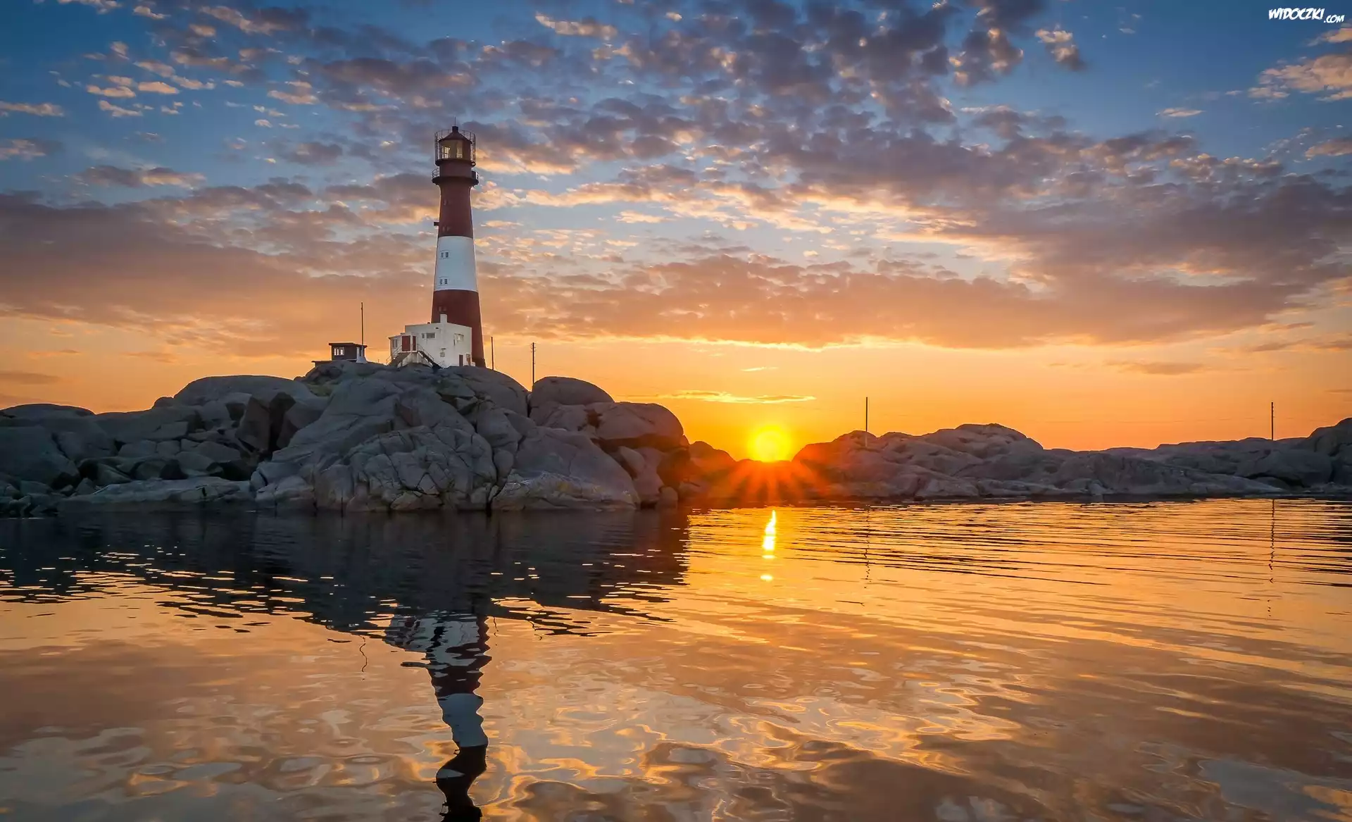 Norwegia, Gmina Egersund, Wyspa Midbrodoya, Latarnia morska Eigeroy, Wybrzeże, Skały, Chmury, Zachód słońca |