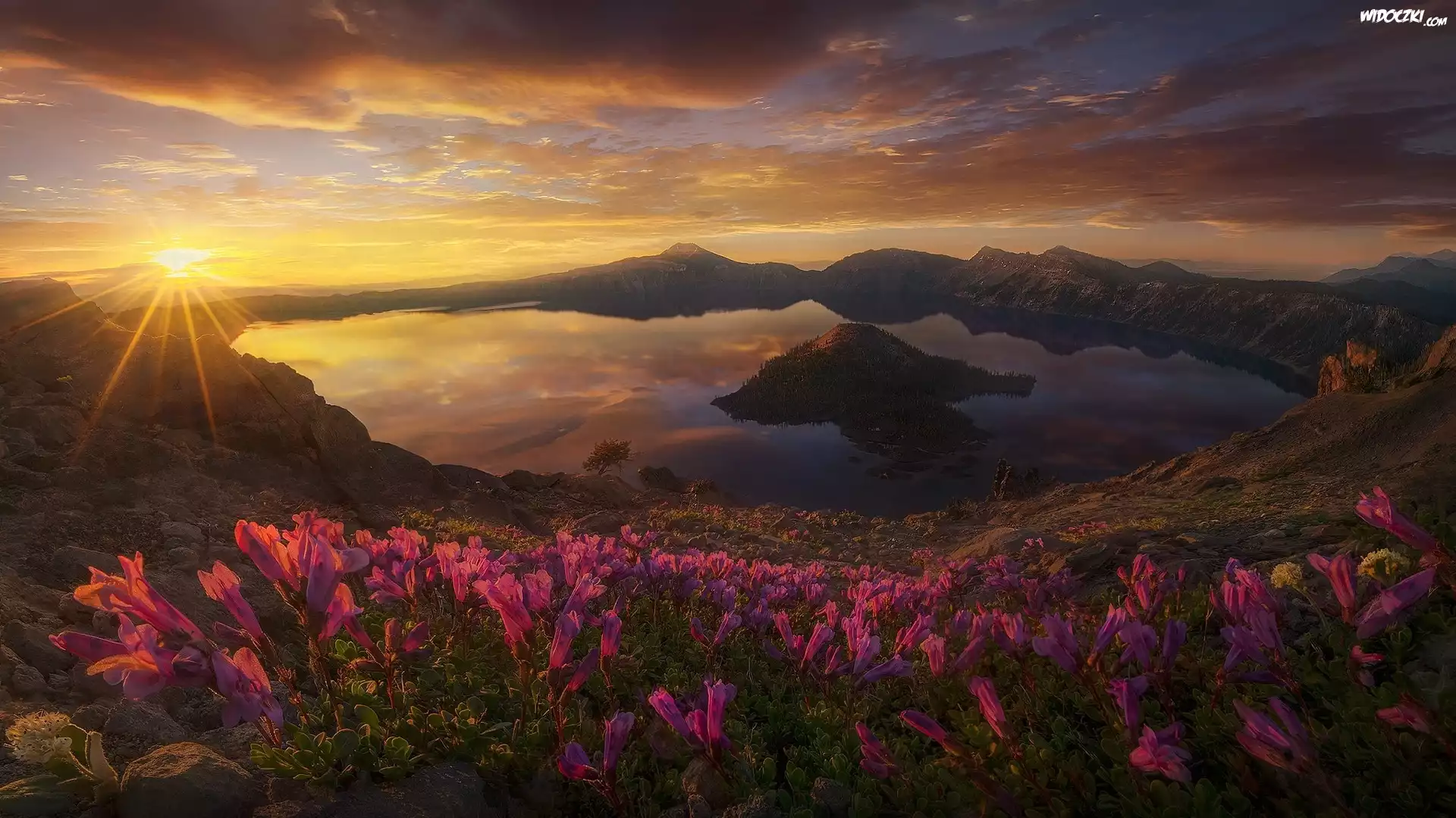 Stany Zjednoczone, Stan Oregon, Wyspa Czarodzieja, Jezioro Kraterowe, Góry, Zachód Słońca, Promienie słońca, Kwiaty |