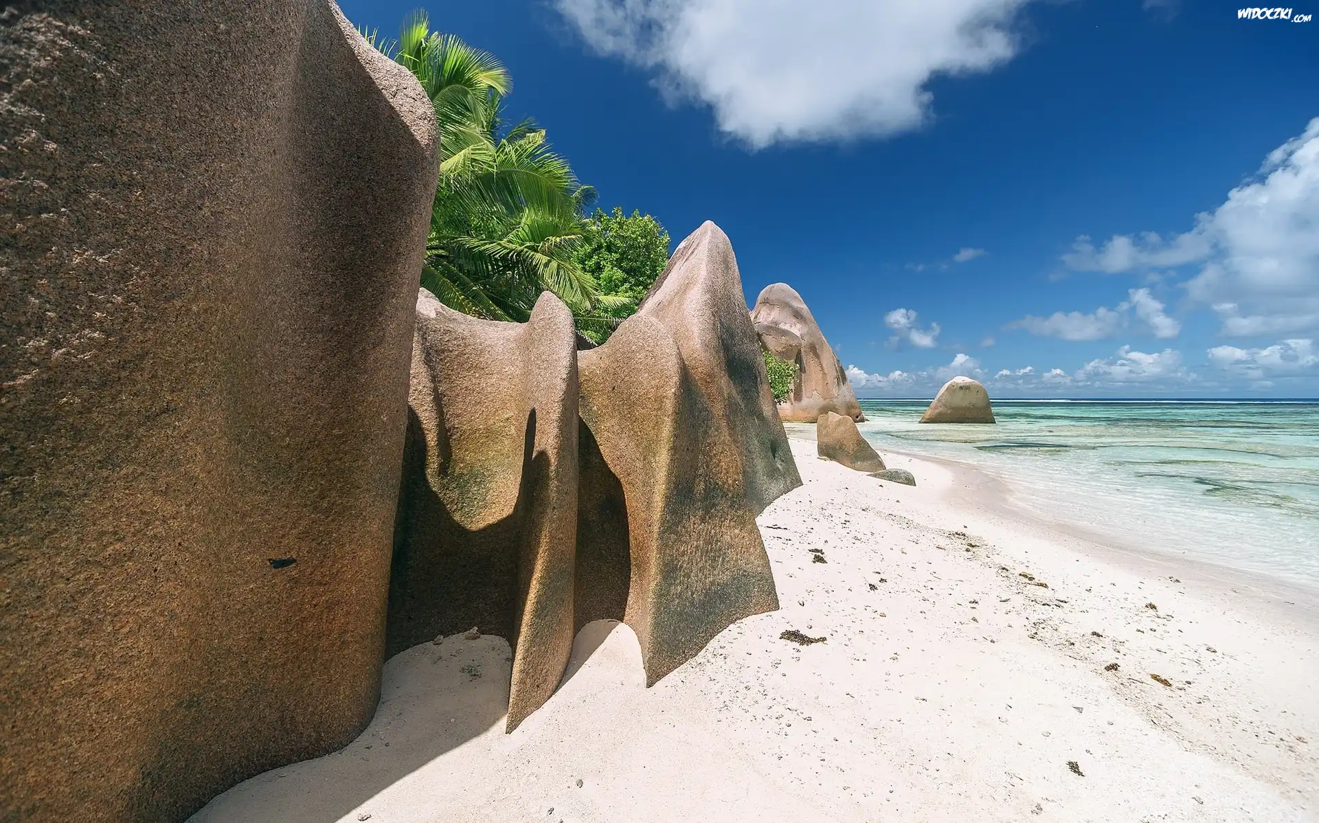 Zdjęcia, Seszele, Wyspa La Digue, Plaża, Skały, Palmy, Tropiki