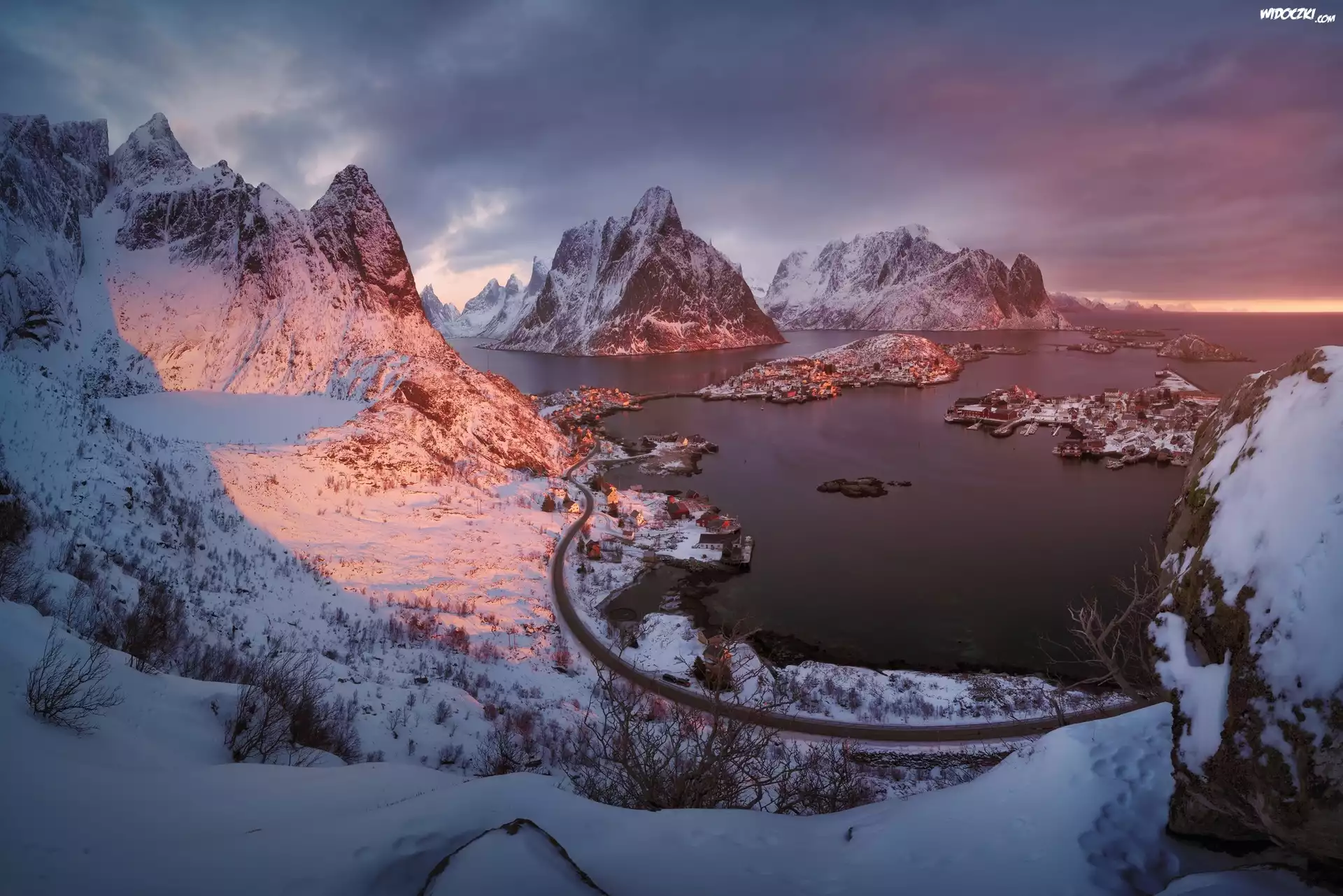 Zdjęcia,  Norwegia, Lofoty, Wyspa Moskenesoya, Wieś Reine, Morze Norweskie Zima, Domy, Góry, Droga