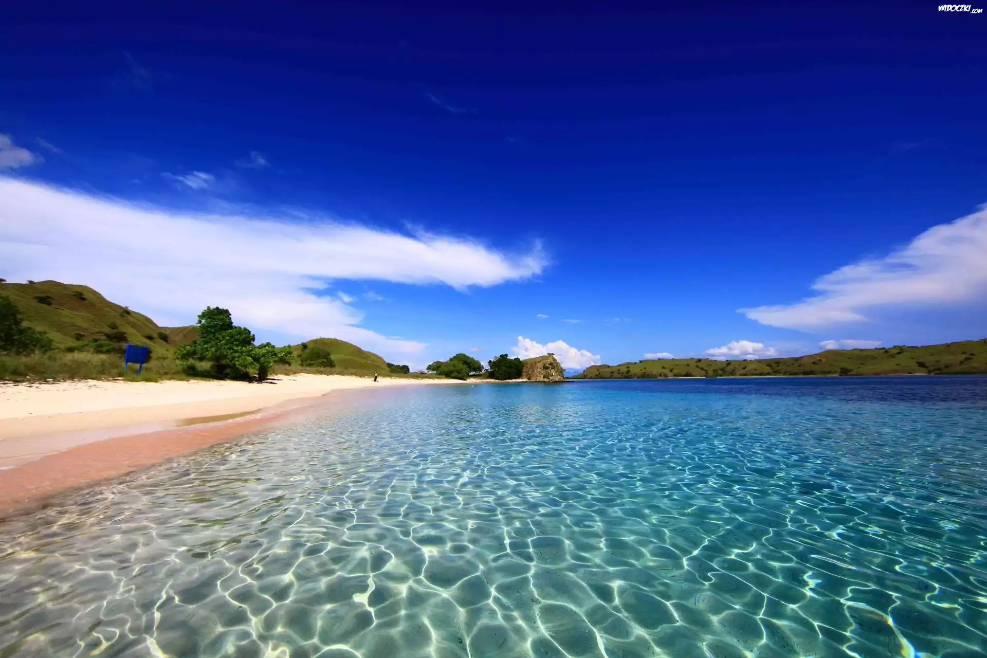Zdjęcia, Wyspa, Komodo, Morze, Plaża, Wzgórza, Drzewa
