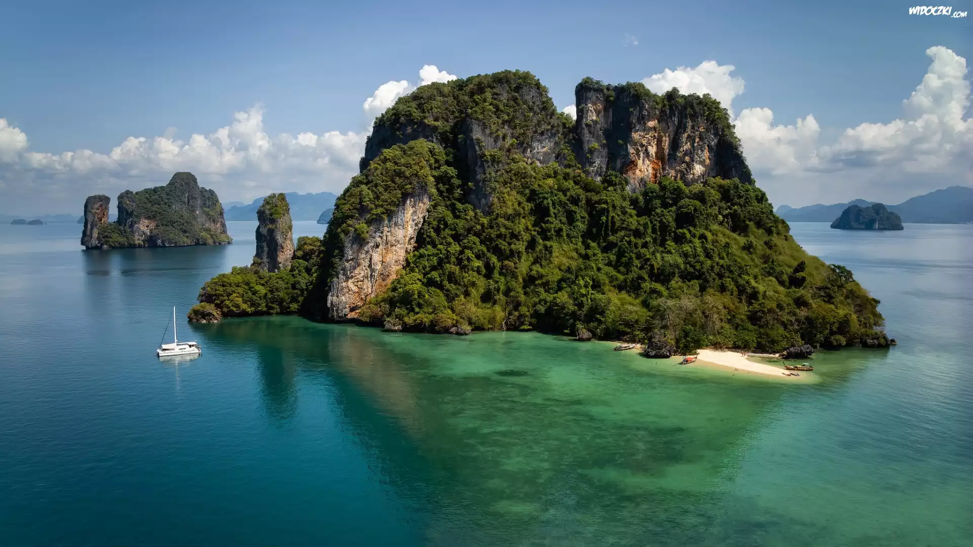 Zdjęcia, Morze, Wyspy, Skały, Drzewa, Niebo