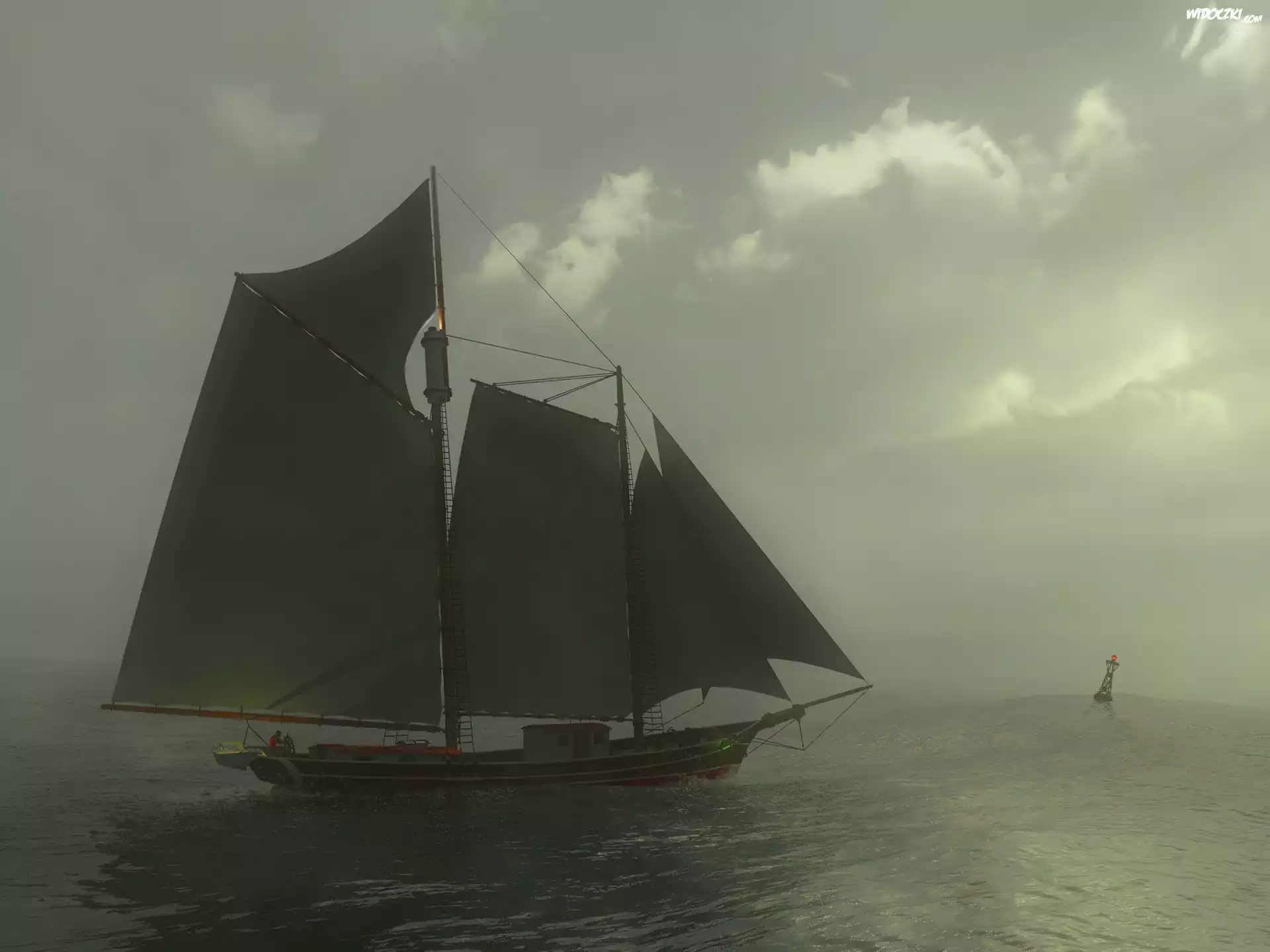 Zdjęcia, Wzburzone, Morze, Boja, Żaglowiec