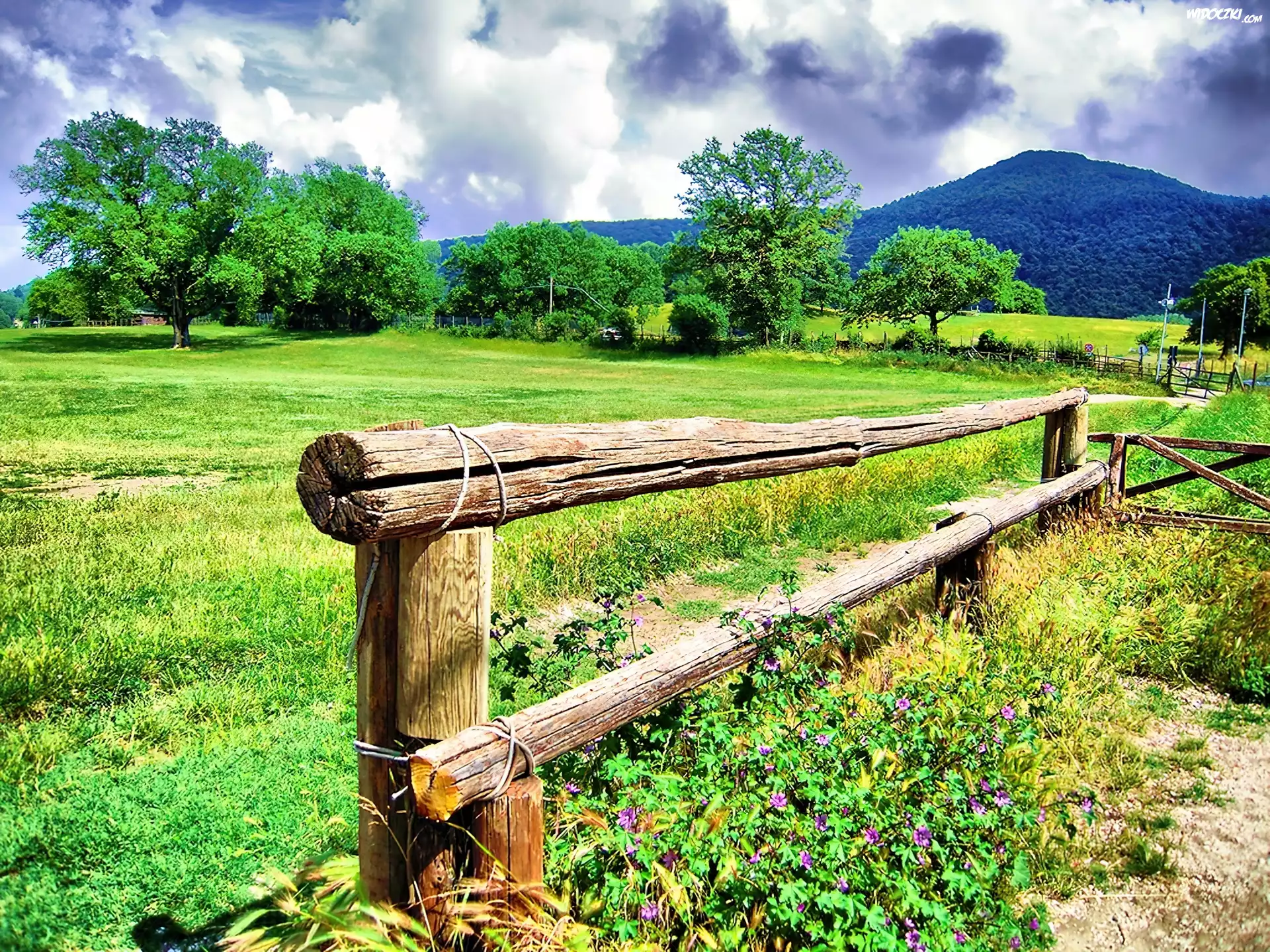 Zdjęcia, Wzgórza, Drzewa, Łąka, Ogrodzenie