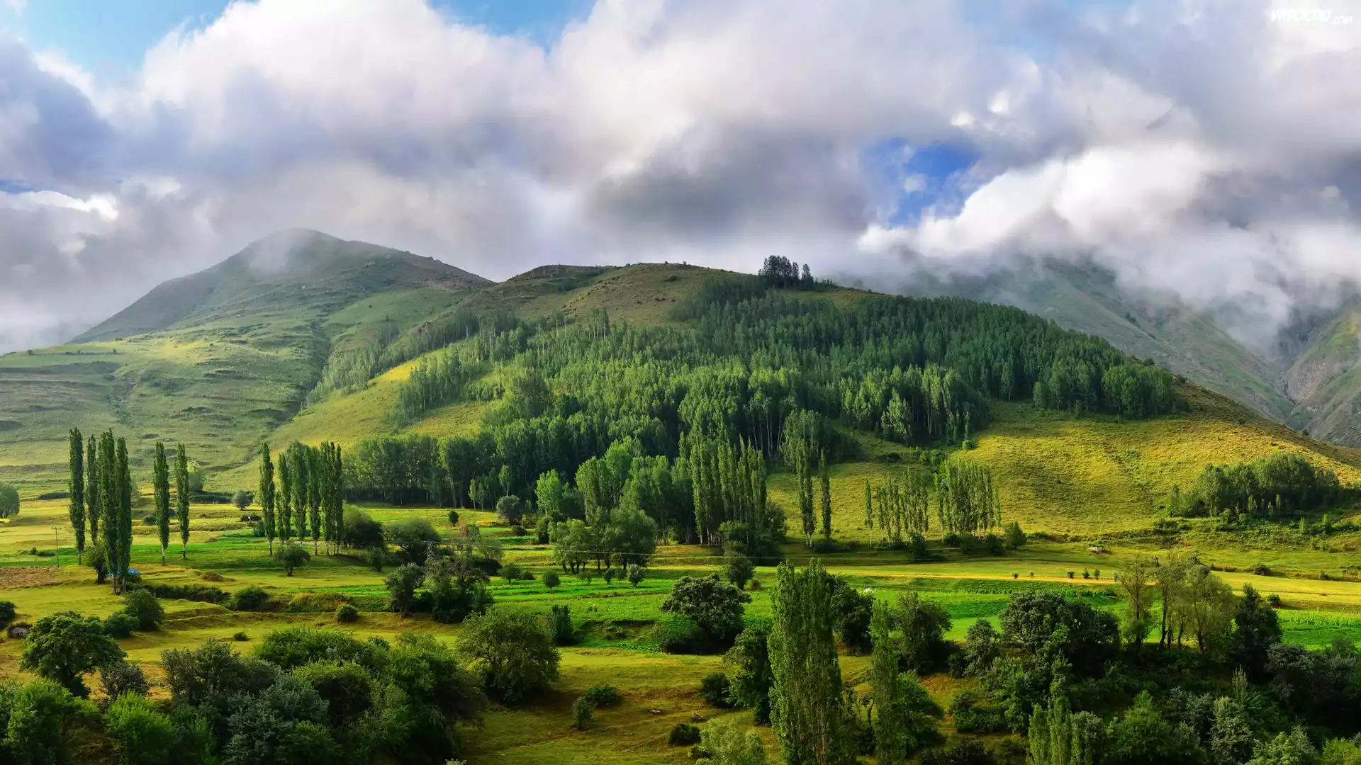 Zdjęcia, Wzgórza, Drzewa, Chmury, Mgła
