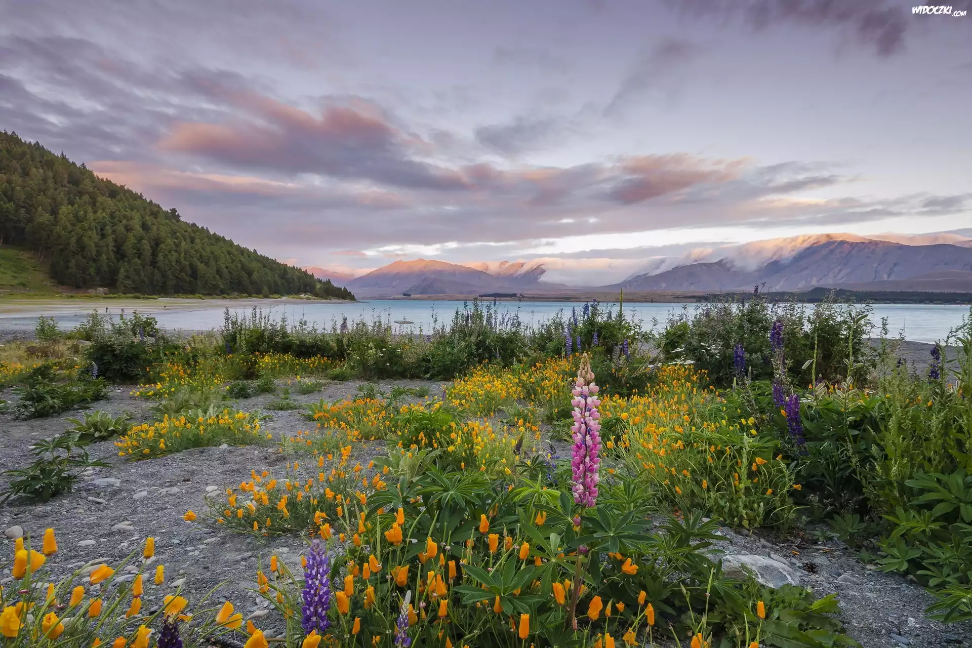 Nowa Zelandia, Jezioro Tekapo, Chmury, Góry, Kwiaty, Łubin, Roślinność, Wzgórza