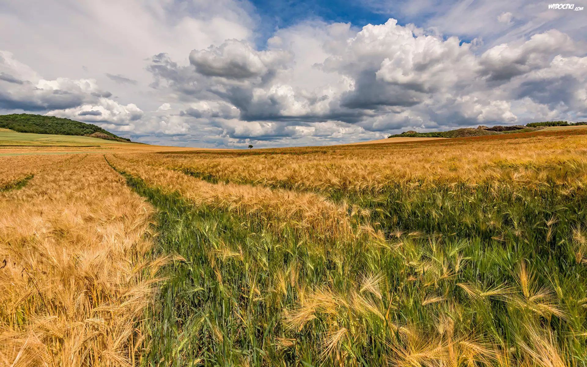 Zdjęcia, Pole, Zboże, Kłosy, Wzgórza, Niebo, Chmury
