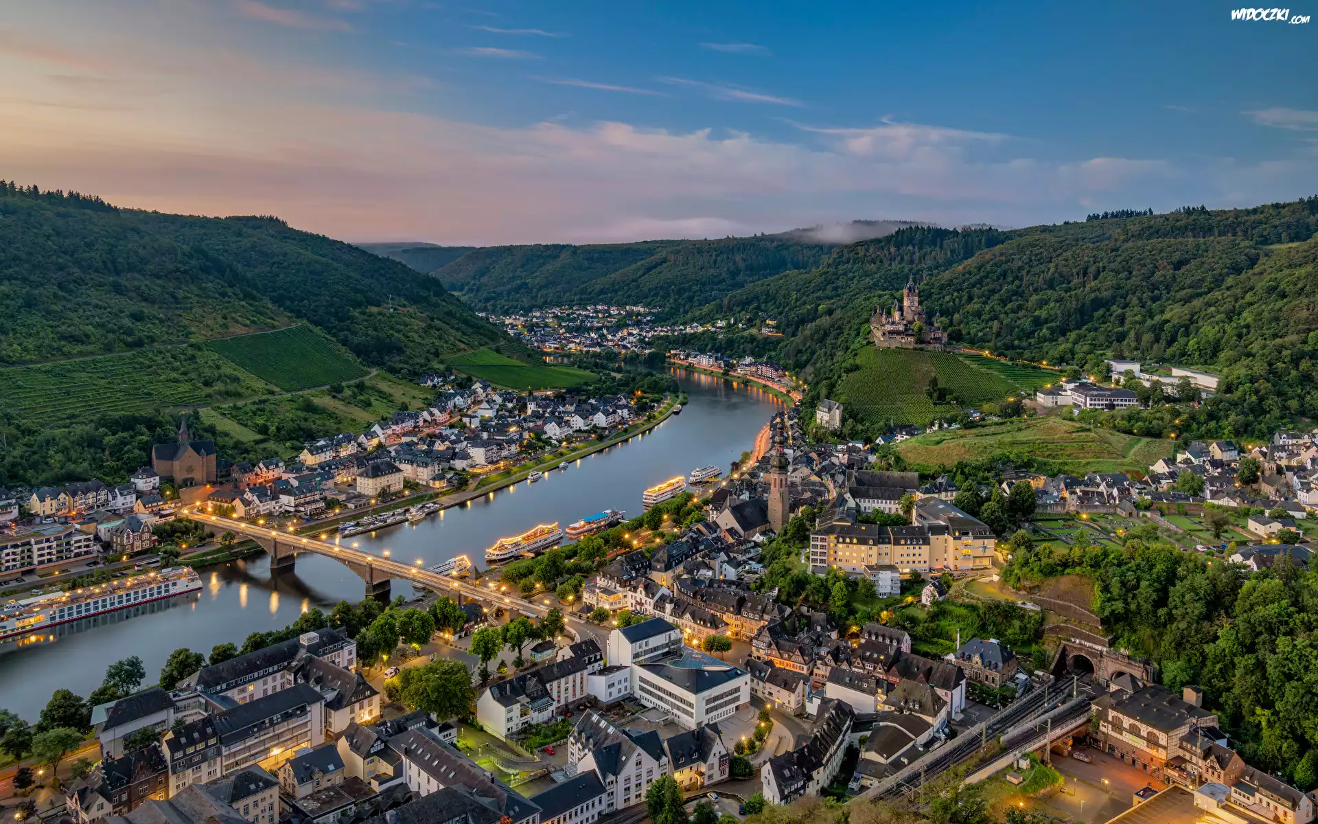 Zdjęcia, Niemcy, Miasto, Cochem, Domy, Światła, Wieczór, Rzeka Mozela, Most, Wzgórza, Las, Drzewa