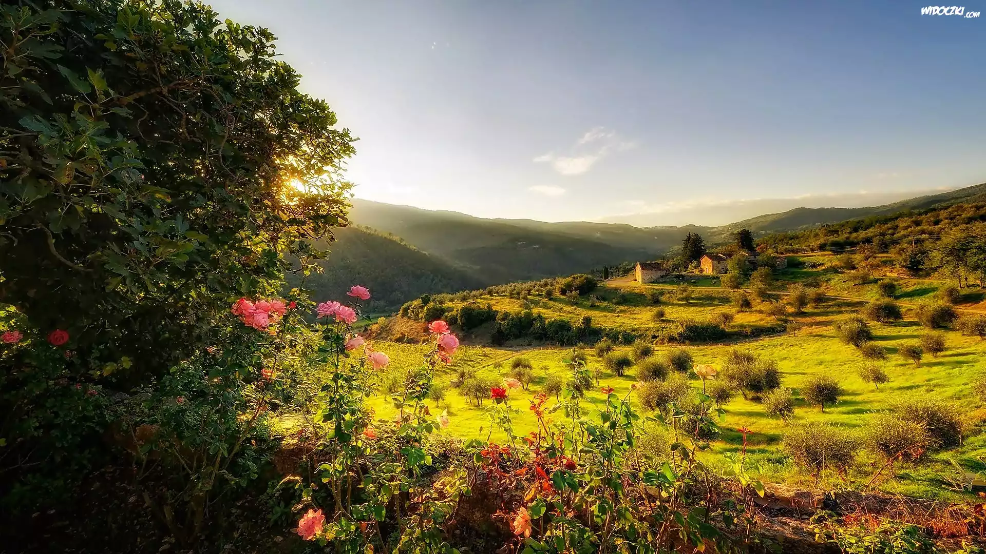 Zdjęcia, Wzgórza, Pola, Domy, Toskania