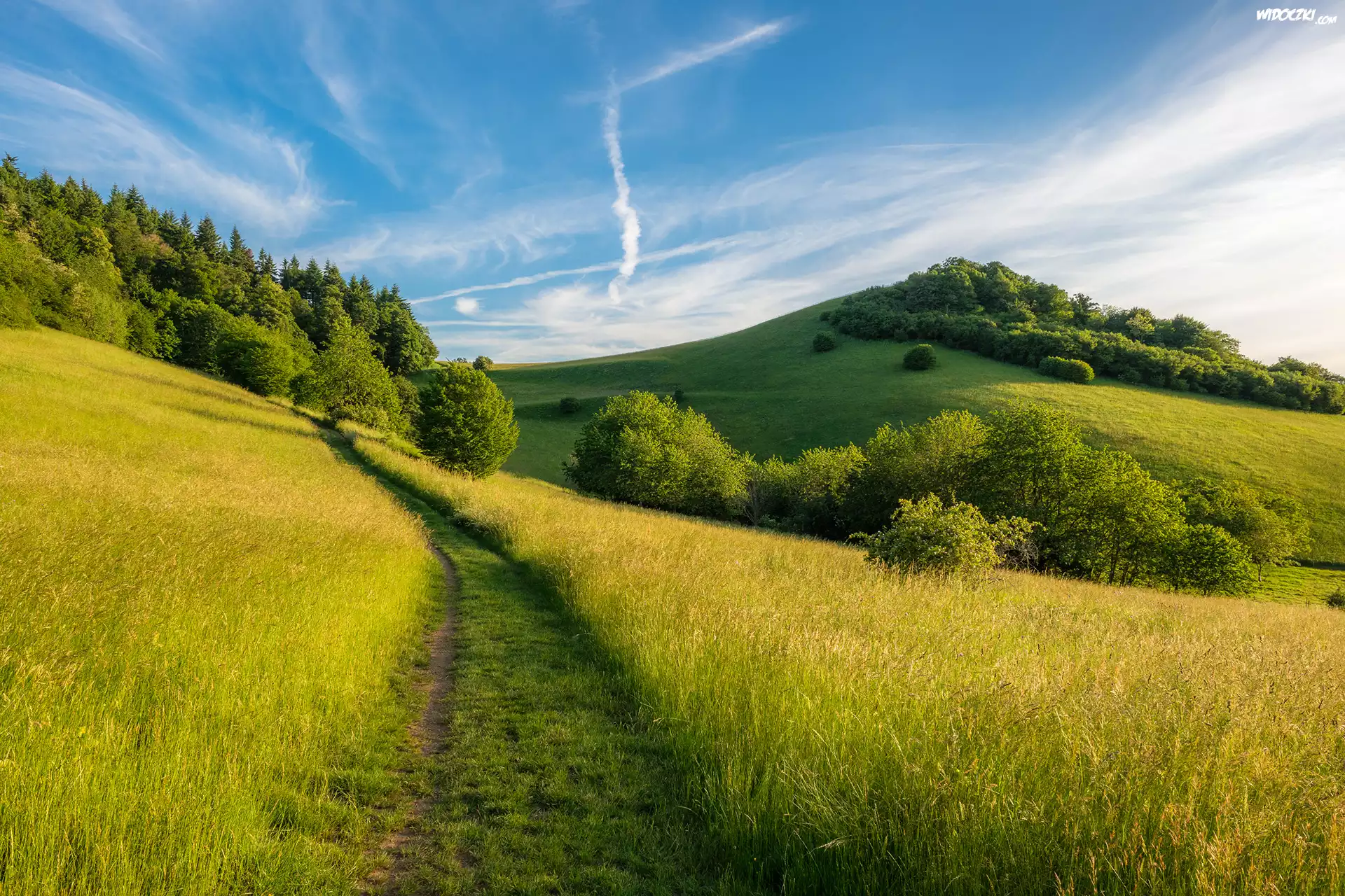 Zdjęcia, Wzgórza, Łąka, Droga, Drzewa