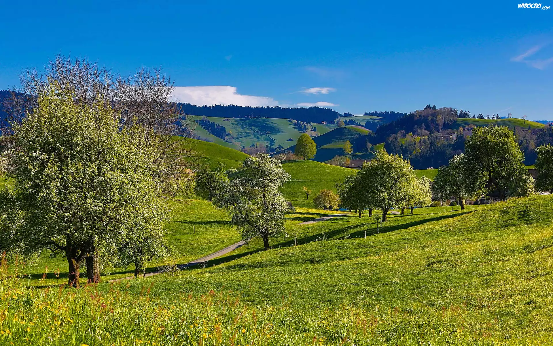 Zdjęcia, Wzgórza, Łąka , Drzewa, Droga