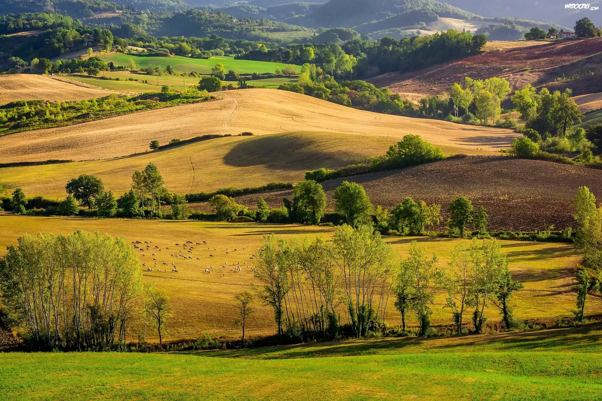 Wzgórza, Pola, Łąki, Drzewa, Owce