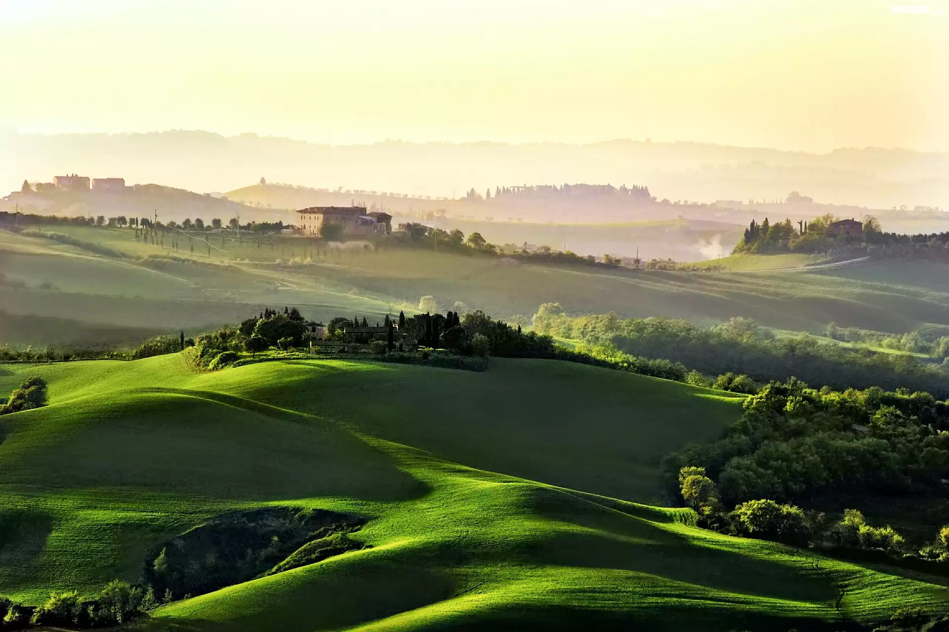 Zdjęcia, Wzgórza, Pole, Drzewa, Domy