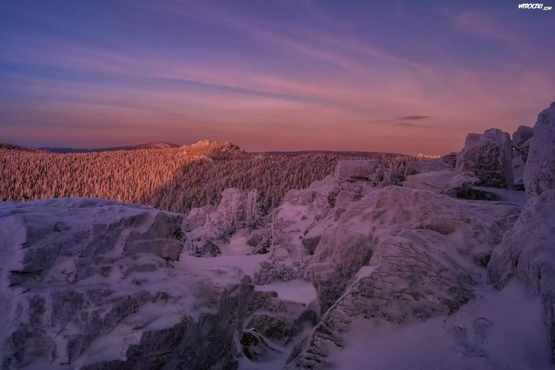 Wzgórza, Góry, Skały, Drzewa, Zima, Zachód słońca, Park Narodowy Taganaj, Obwód czelabiński, Rosja |