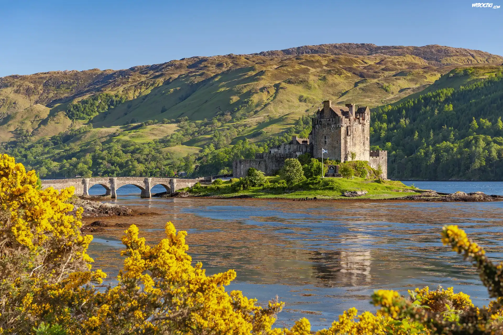 Jesień, Szkocja, Zamek, Eilean Donan Castle, Most, Wzgórza, Jezioro, Loch Duich Eilean Donan, Las, Drzewa |