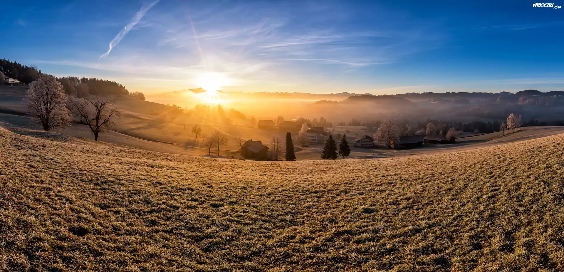 Gmina, Kirchberg in Tirol, Wzgórza, Drzewa, Domy, Wschód słońca, Mgła, Kanton St. Gallen, Szwajcaria |