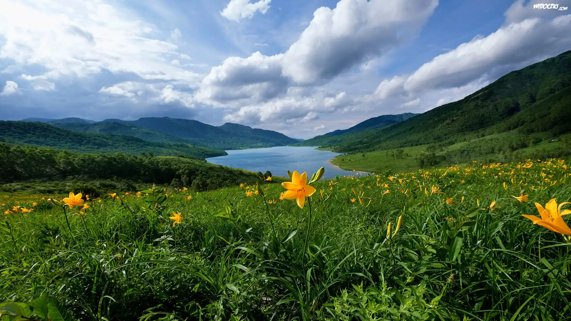 Zdjęcia, Góry, Wzgórza, Jezioro, Łąka, Kwiaty, Żółte, Lilie