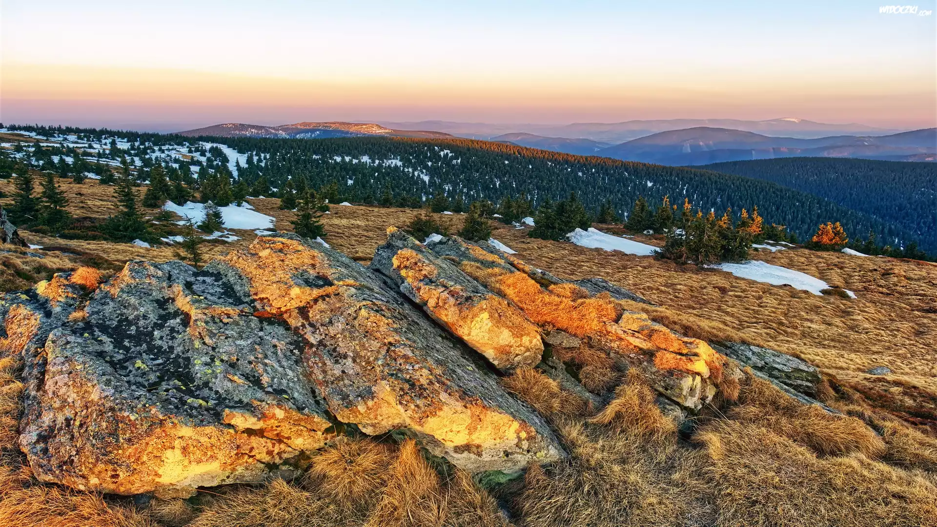 Góry, Wzgórza, Skały, Drzewa, Śnieg, Pożółkła, Trawa