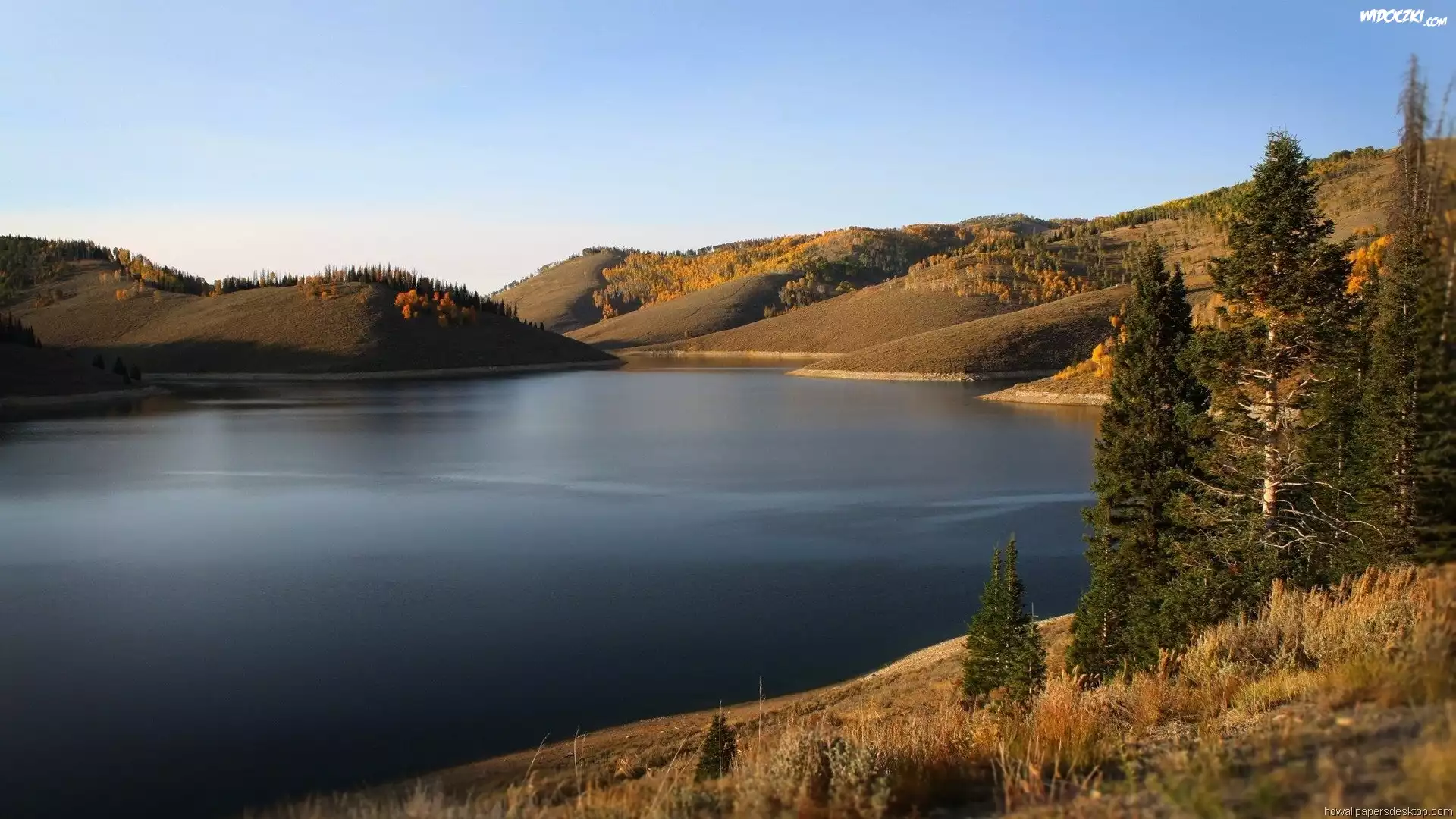 Zdjęcia, Jezioro, Wzgórza, Drzewa