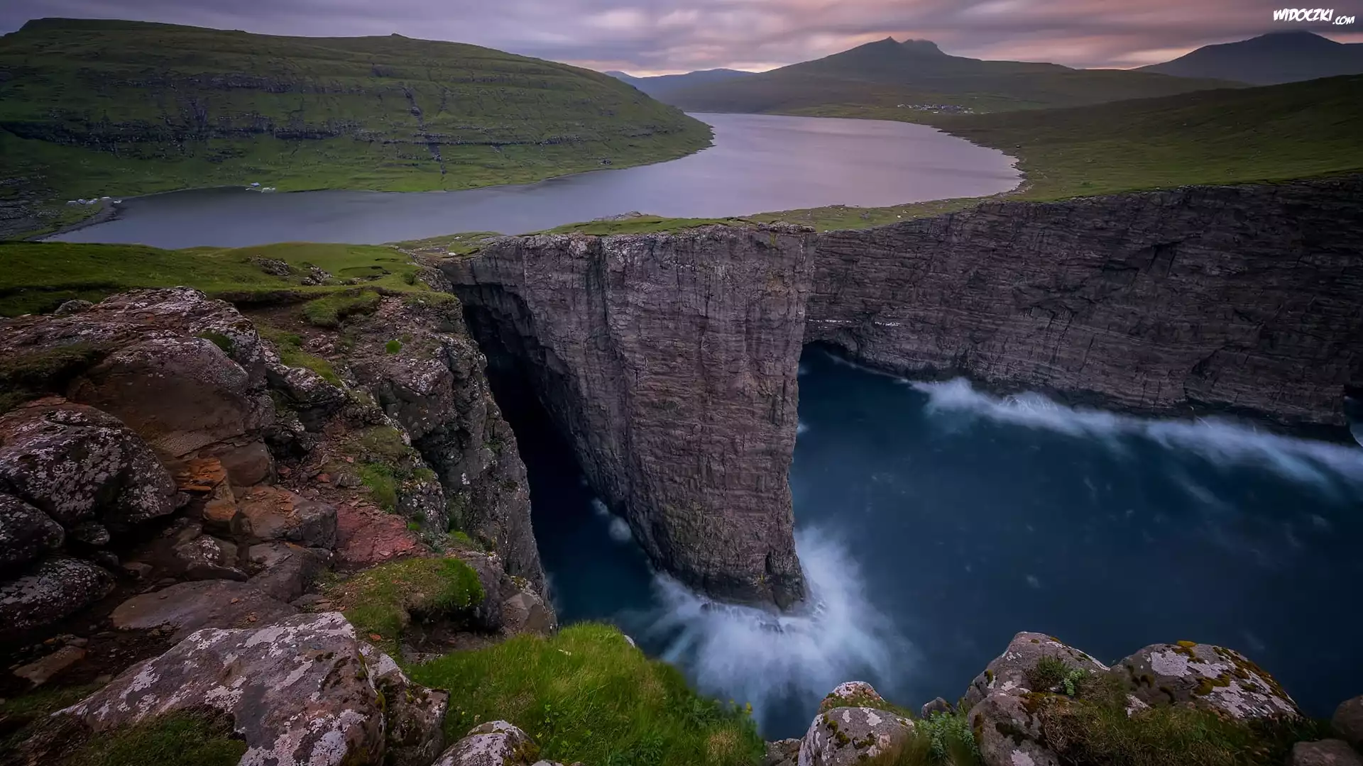 Zdjęcia, Morze, Klif, Wzgórza, Góry, Jezioro Sorvagsvatn, Wyspa Vagar, Wyspy Owcze, Dania