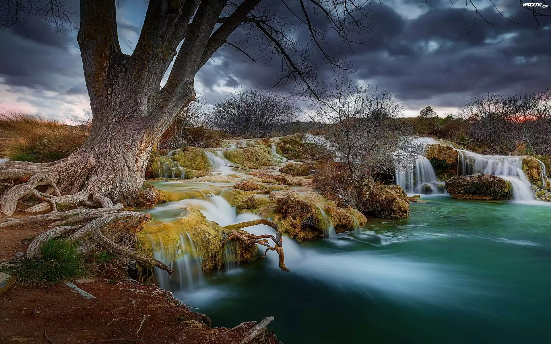 Rzeka, Wzgórza, Drzewa, Wodospad, Ciemne, Chmury, Bajeczny, Krajobraz